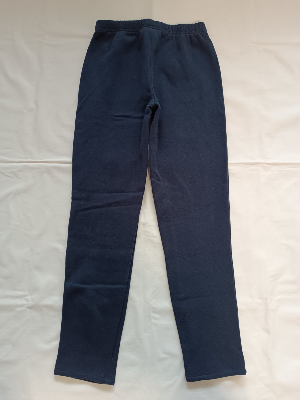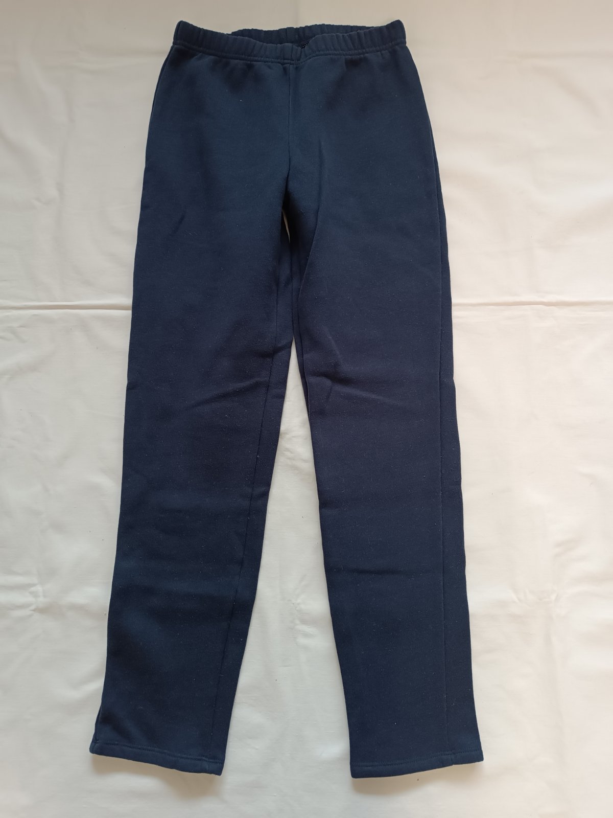 Tmavě modré bavlněné tepláky koupebe v Tchibo, s pruhovanými náplety v pase a na nohavicích. Silnější úplet, uvnitř smyčka - ne teplý chloupek. Mírný prací chloupek, po 1 dítěti.