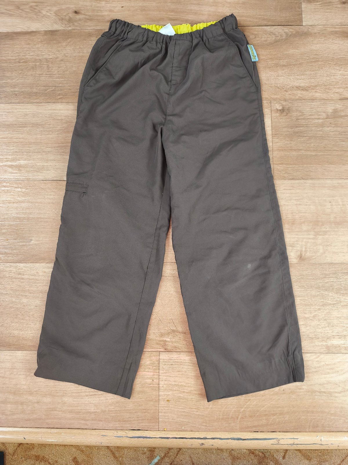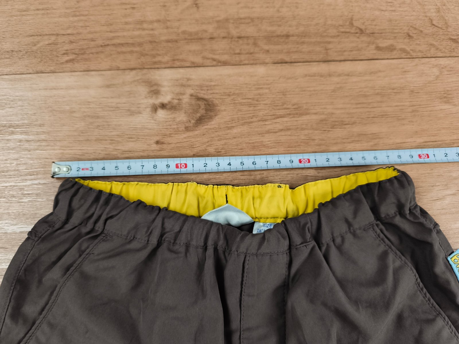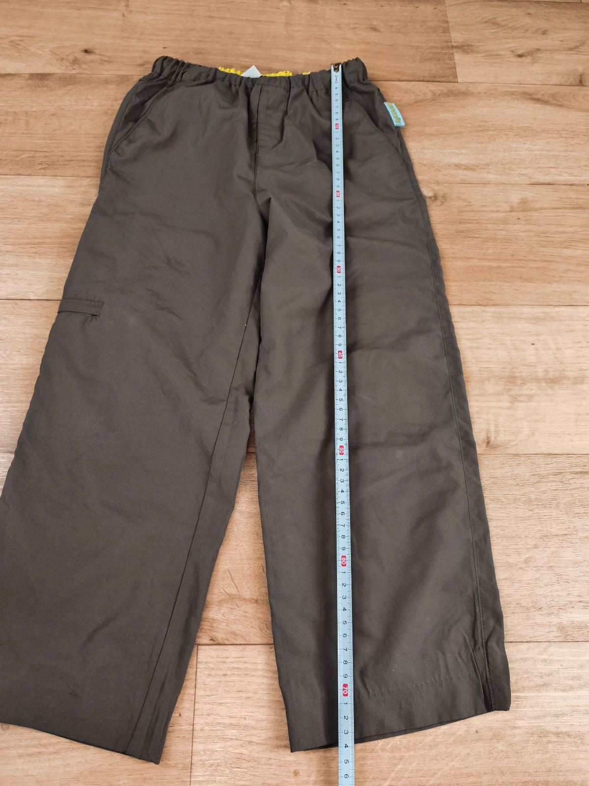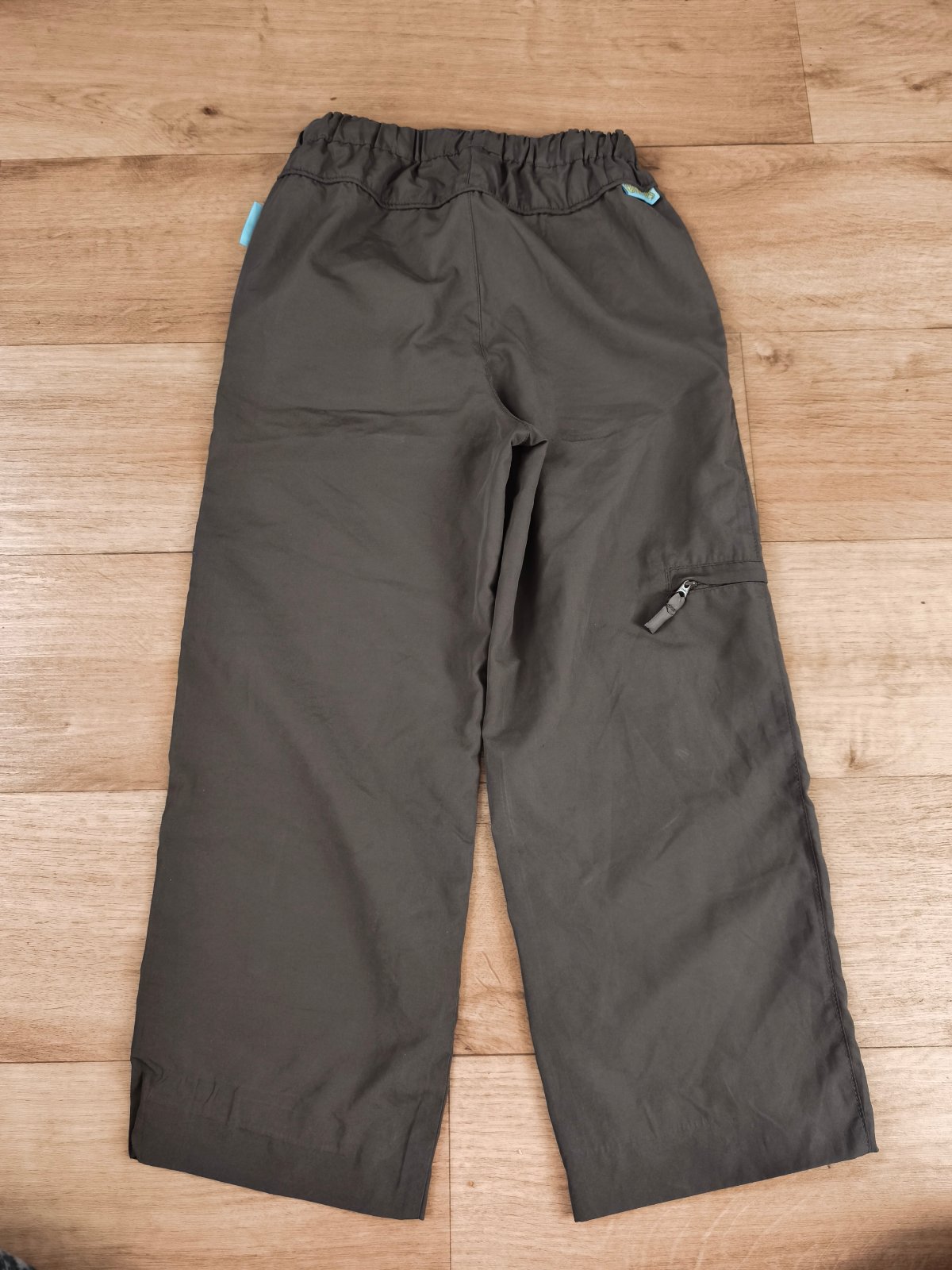 Tenké šusťákové kalhoty, bez podšívky, široké nohavice. Jedna kapsa na zip. Velikost neuvedena, odhaduji 128/134 - rozměry na fotkách.