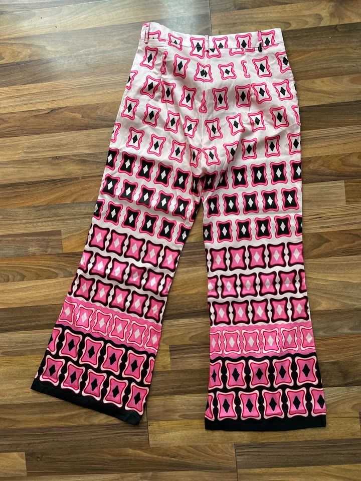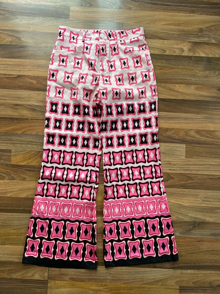 3058. nabízím k prodeji tyto růžové kalhoty se vzorem, vel M, ale řekla bych možná spíše S/M, měřte prosím, nepruží, Shein. Materiál jako silonový satén. Pas pevný na knoflík a zip. 100% polyester. Nové, bez vad, krásné