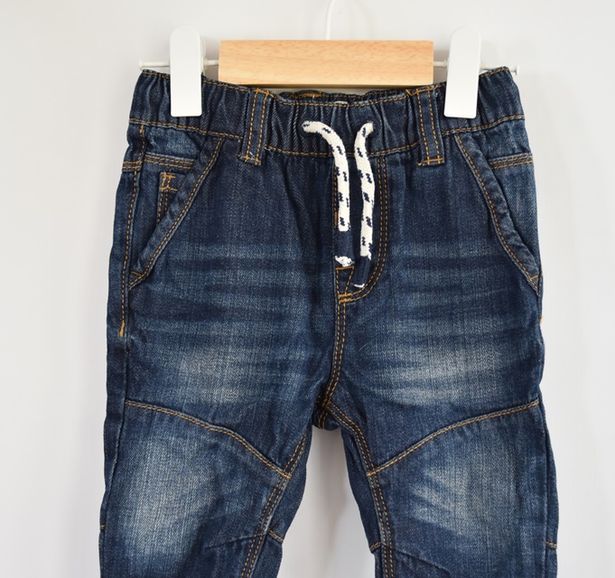 Tm. modré džíny. V pase guma. Nejsou pružné. Šňůrka funkční.
