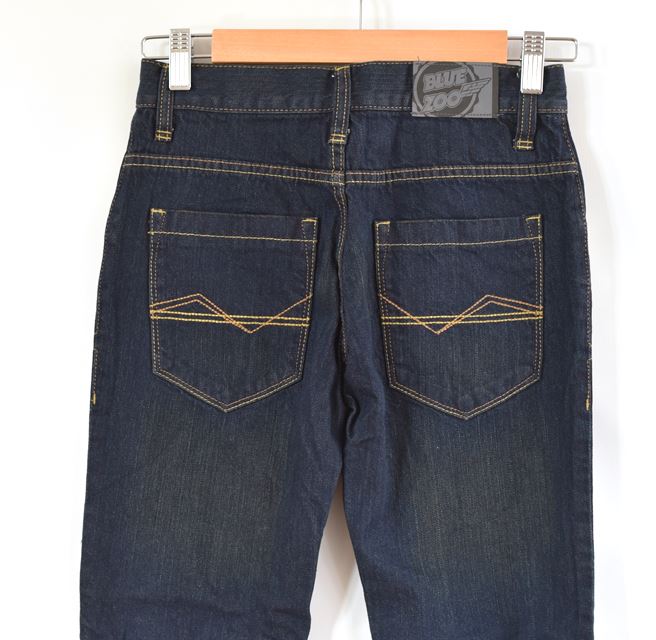 Tm. modré džíny. Džíny nepruží, v pase není regulace.