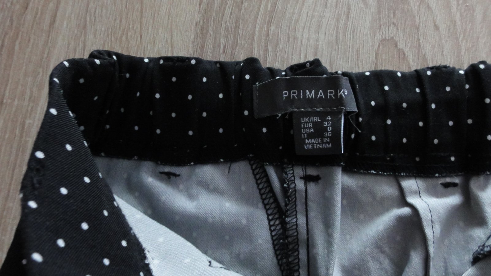 Strečové kalhoty, barva černá s bílými puntíky. Délka kalhot 86 cm, v pase v zadní díle guma 2 x31cm/ měřeno s natáhlou gumou. Boky 2 x 34 cm.