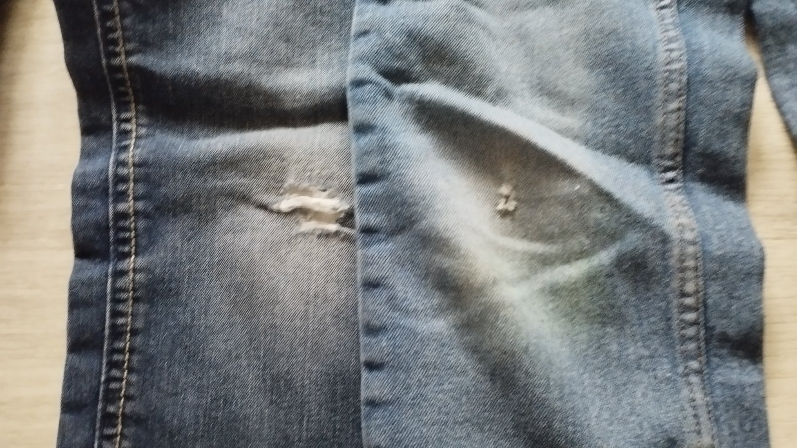 Rifle 134, jedny mají špinavé kolena a díru, druhé jen díru, na donošení do školy, 50,- za oboje