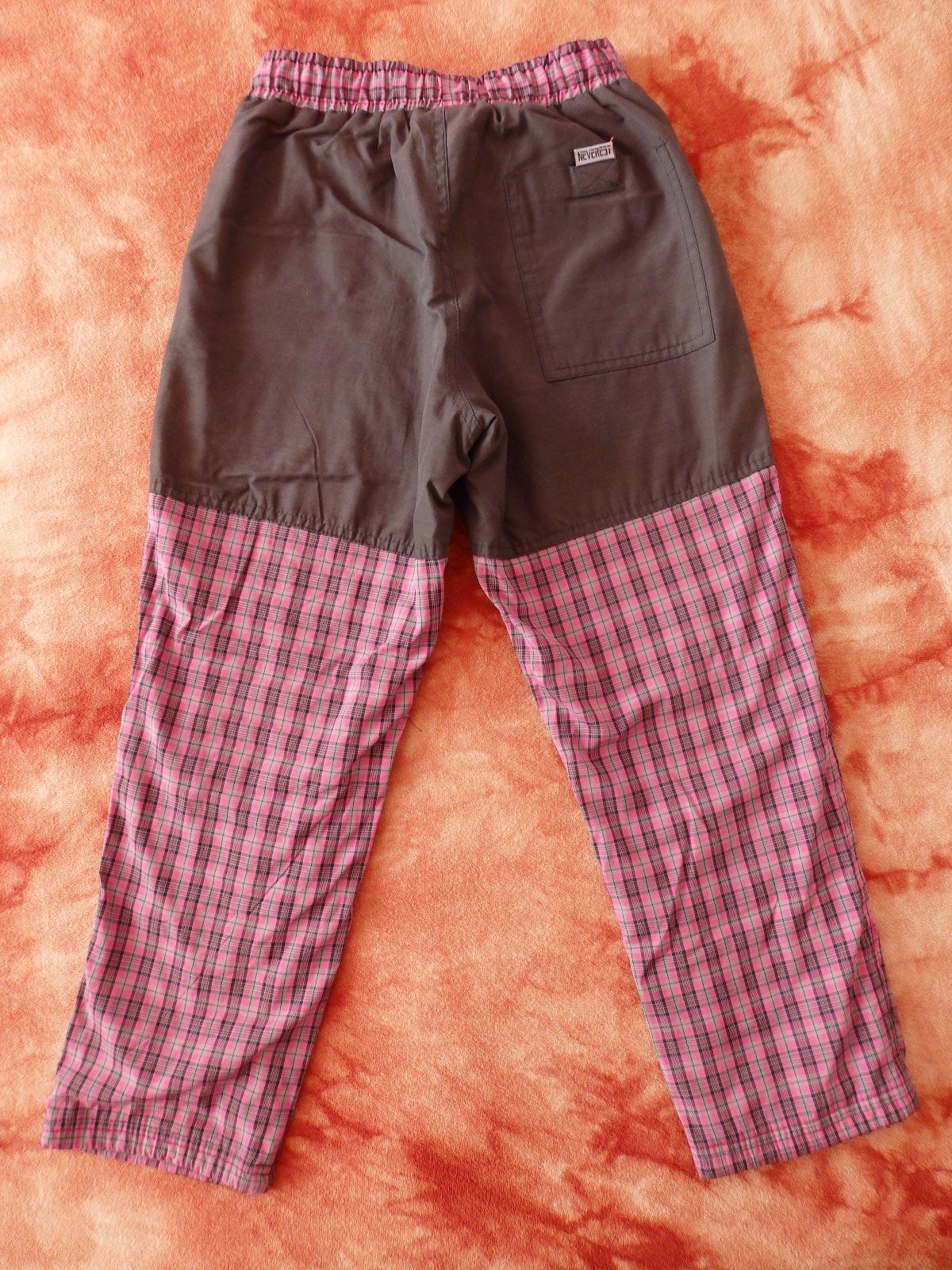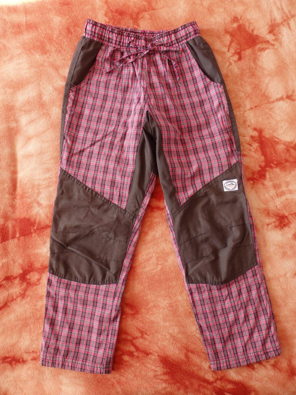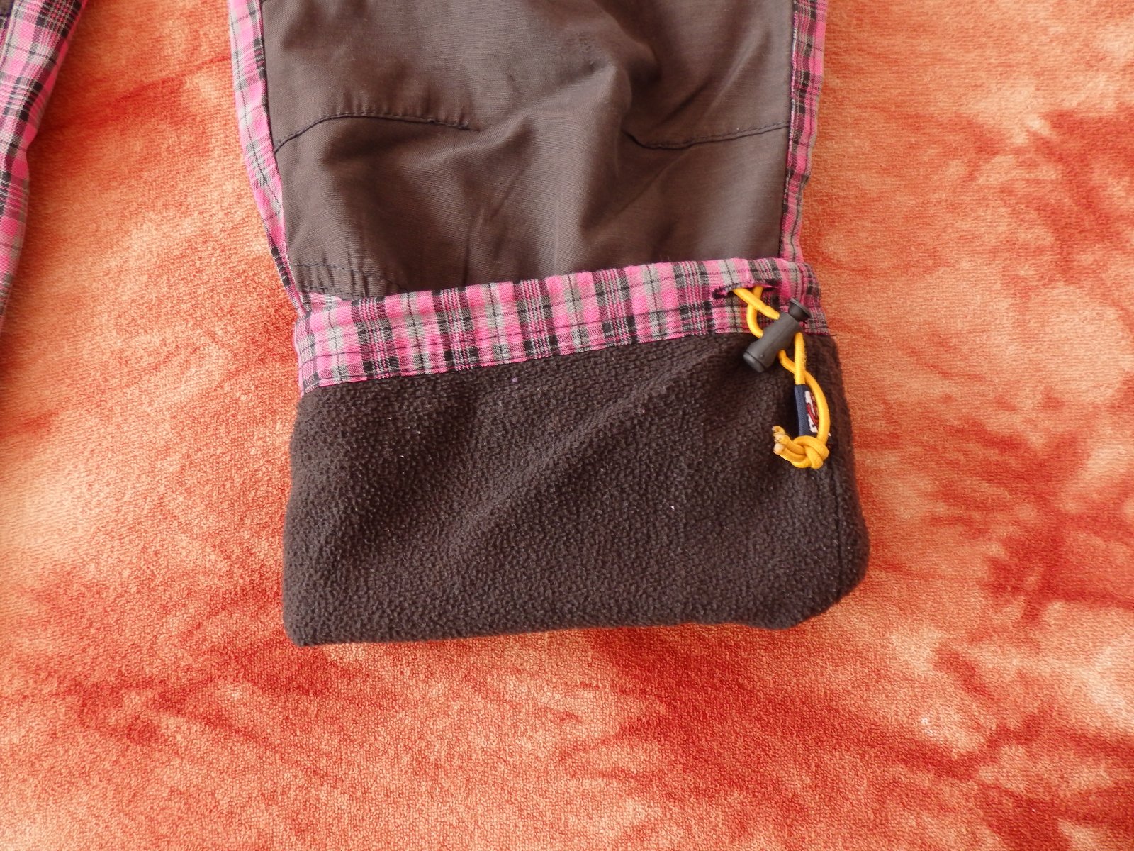 Moc pěkné flísem zateplené kalhoty, měkkoučké a velmi pohodlné, bohužel na pravém kolínku dírka (nafoceno). Jinak v pořádku. Olivka na konci nohavic, v pase šňůrka na utažení. Dvě přední kapsy, jedna zadní.