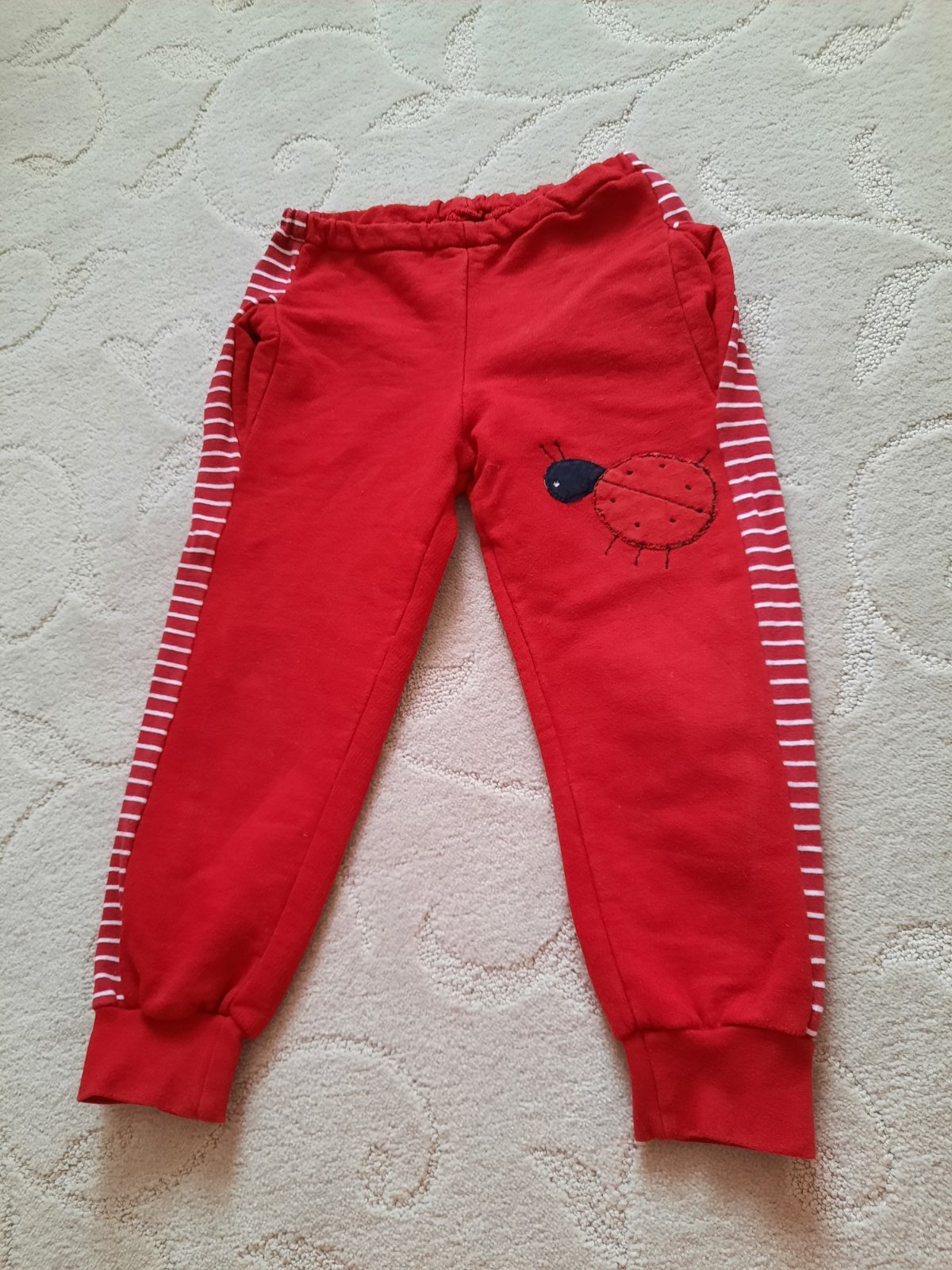 Prodám na zakázku šité tepláky s kapsami a s nášivkou berušky, český výrobce. Tepláky málo nošené, drobný prací chloupek, bez vad.