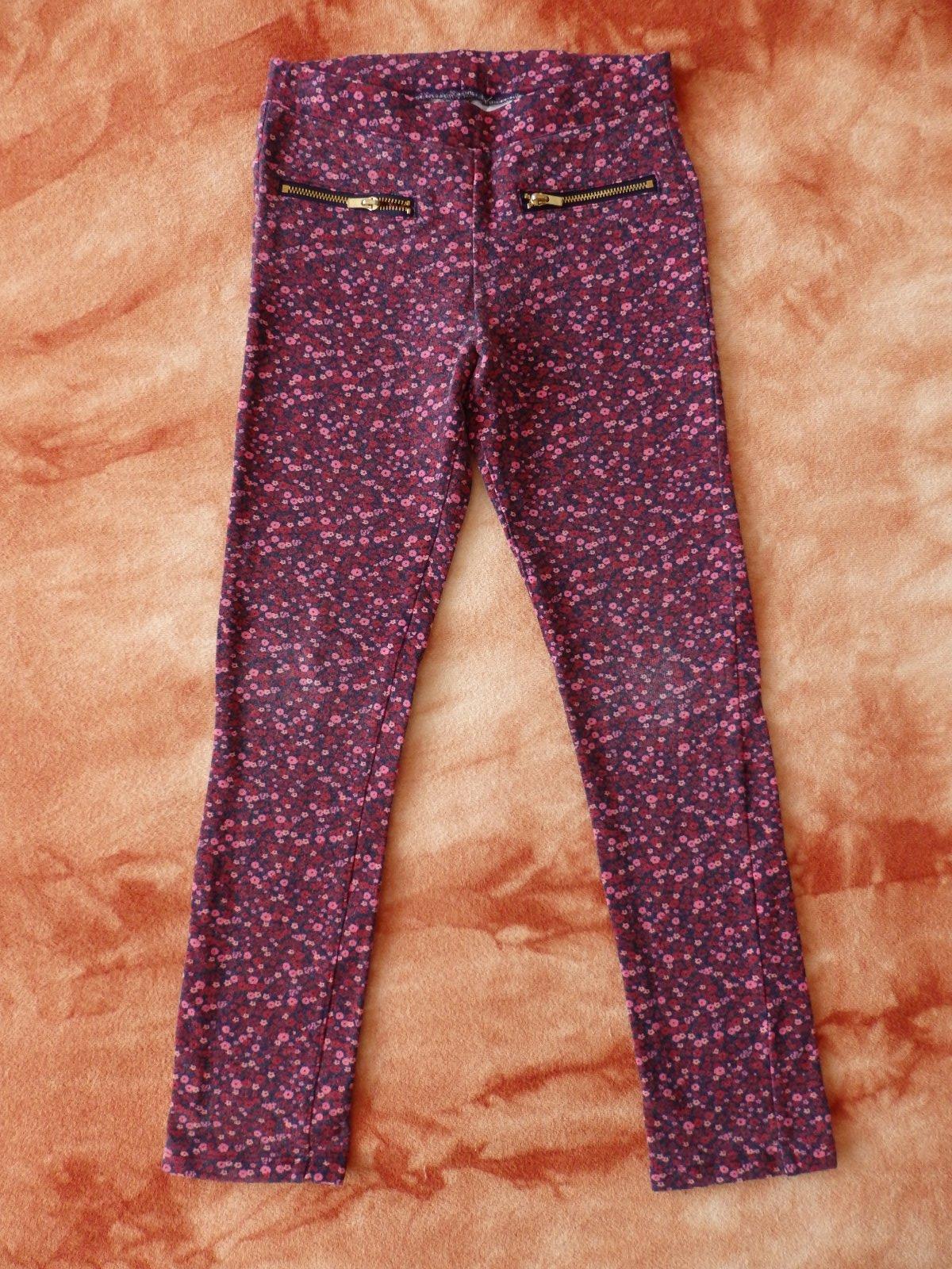 Pěkné a pohodlné kalhoty (tregíny) s kytičkami, odstíny vínové a růžové, materiál bavlna s elastanem, falešné přední kapsy. Pevnější materiál než legíny, ale také příjemně pruží. Pěkný stav, kolínka maličko světlejší, nic vážného.