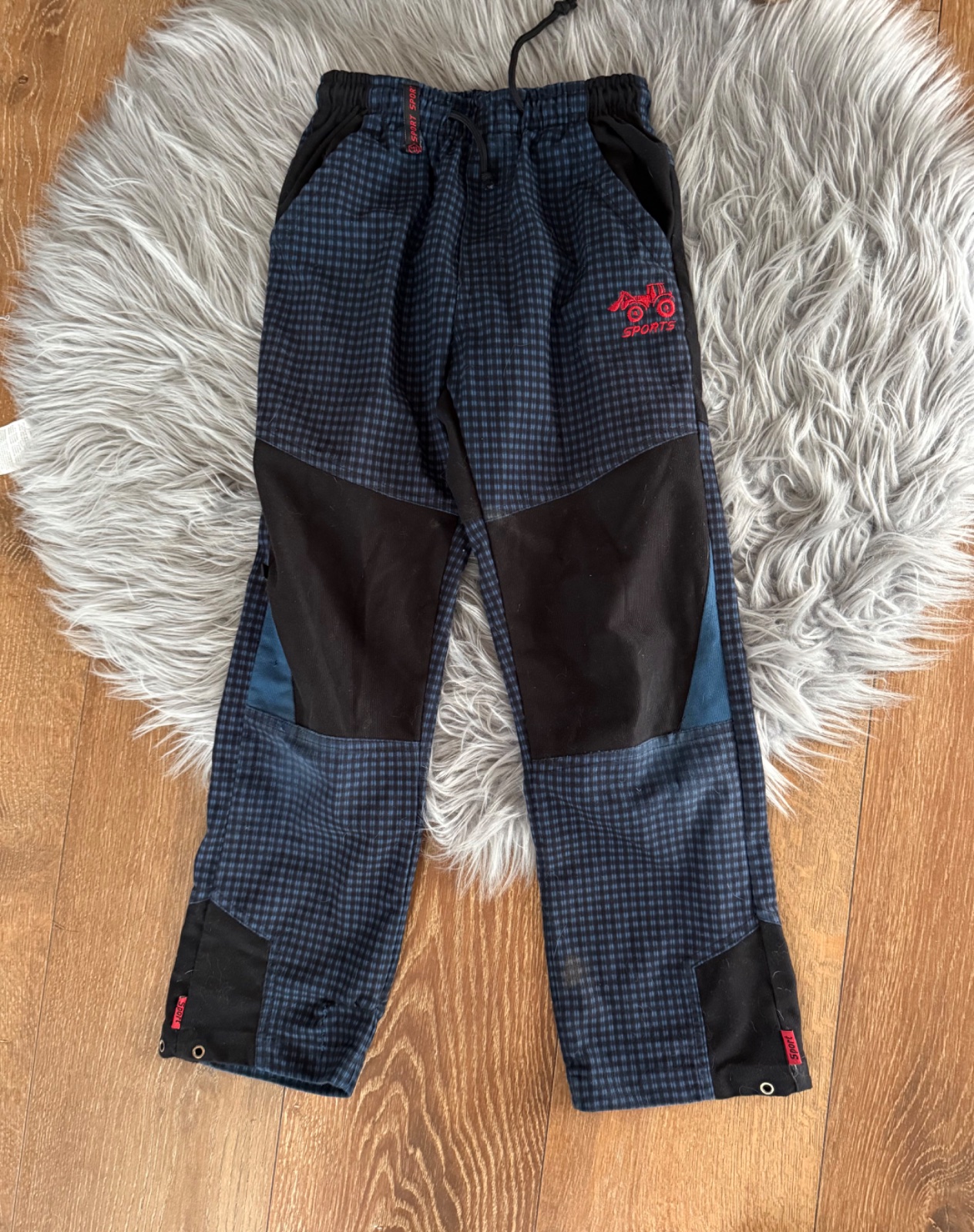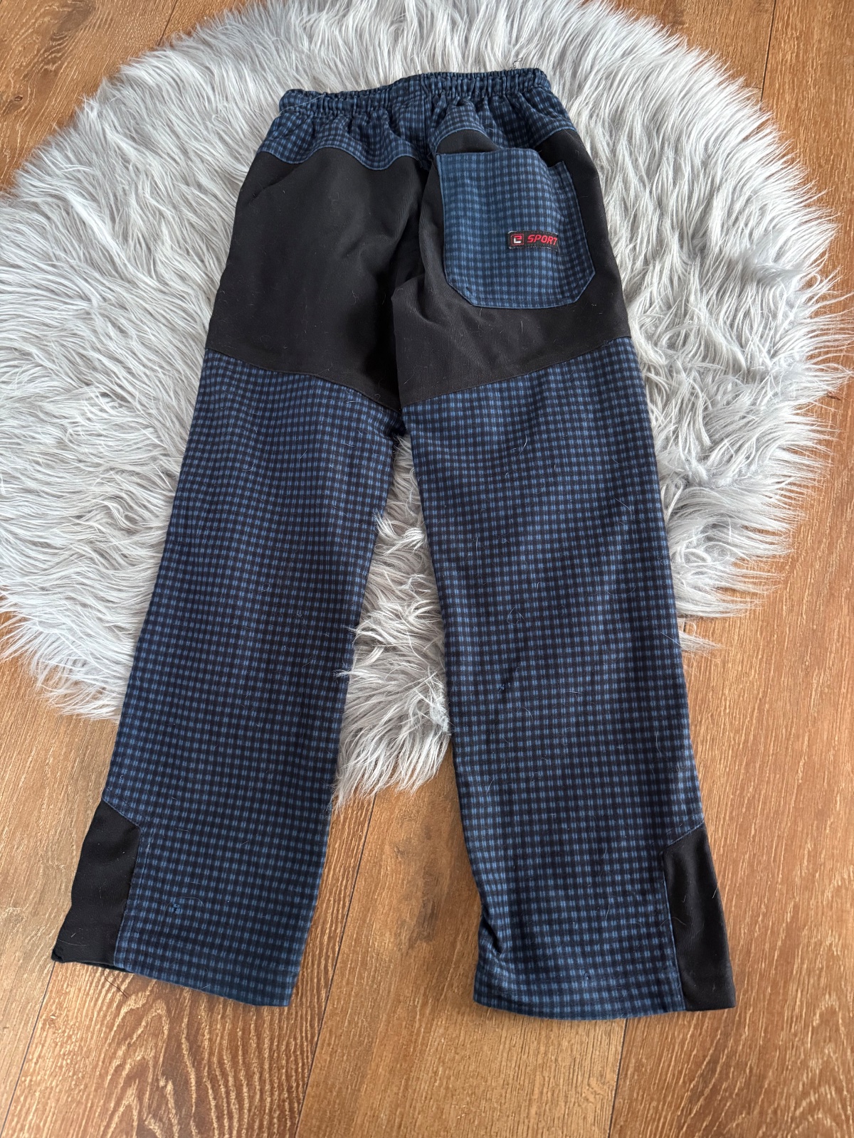 Tmavě modré softshellové kalhoty na zimu, vyteplené flísem. Vel. 140, délka 84 cm, nohavice od rozkroku 57 cm. Bez vad.