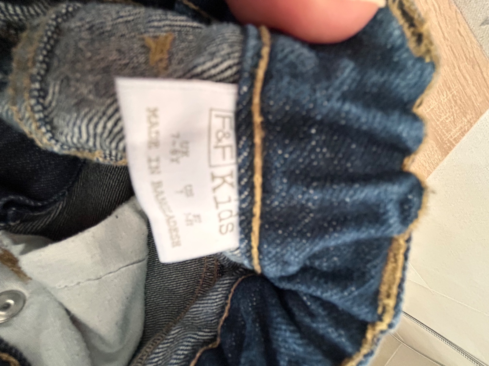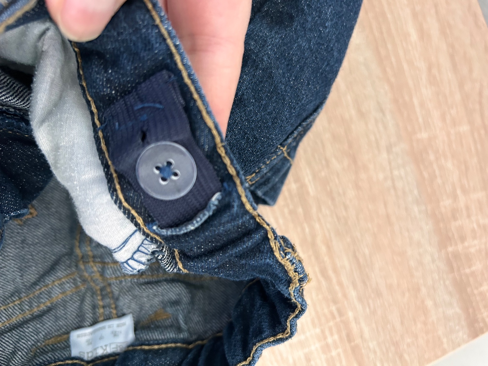 nohavice zezadu roztřepené, nápis se loupe, na zadku zašitá díra