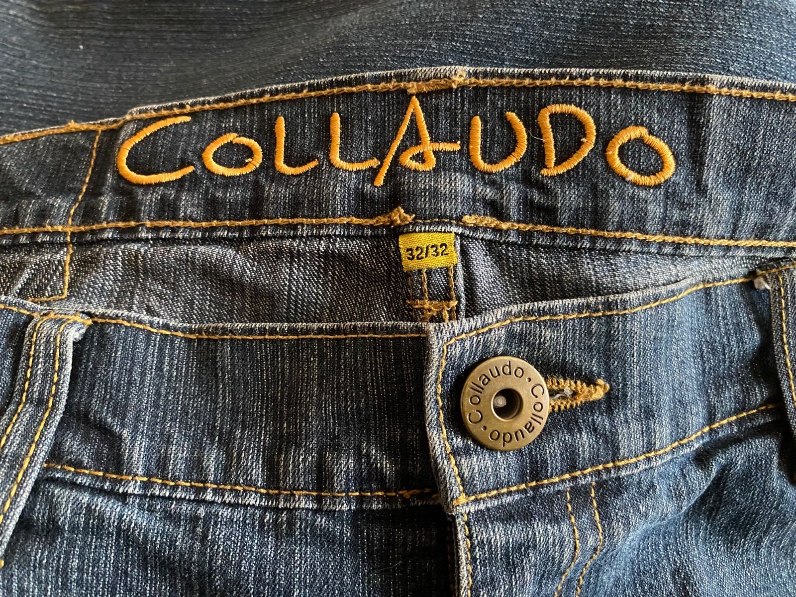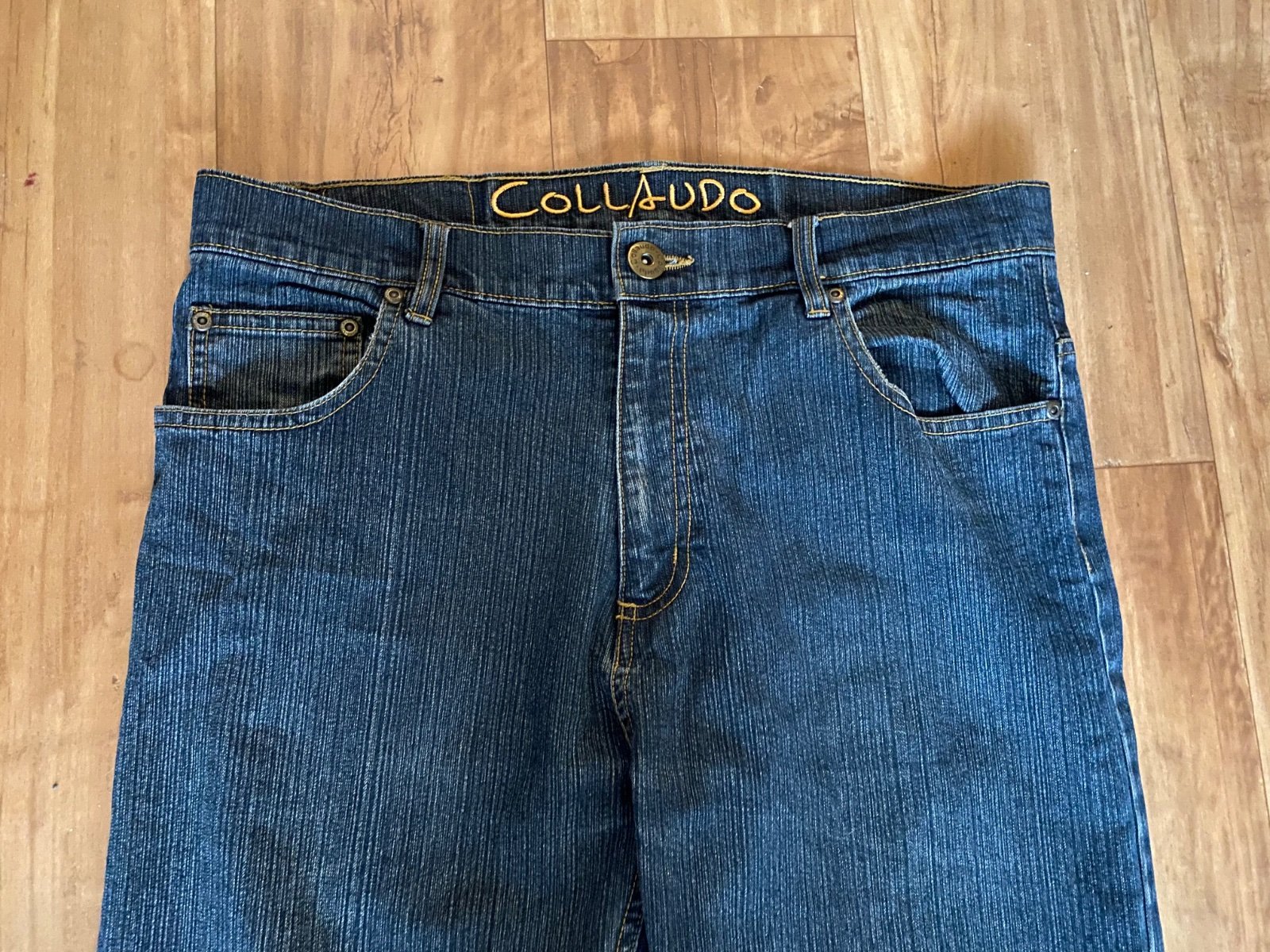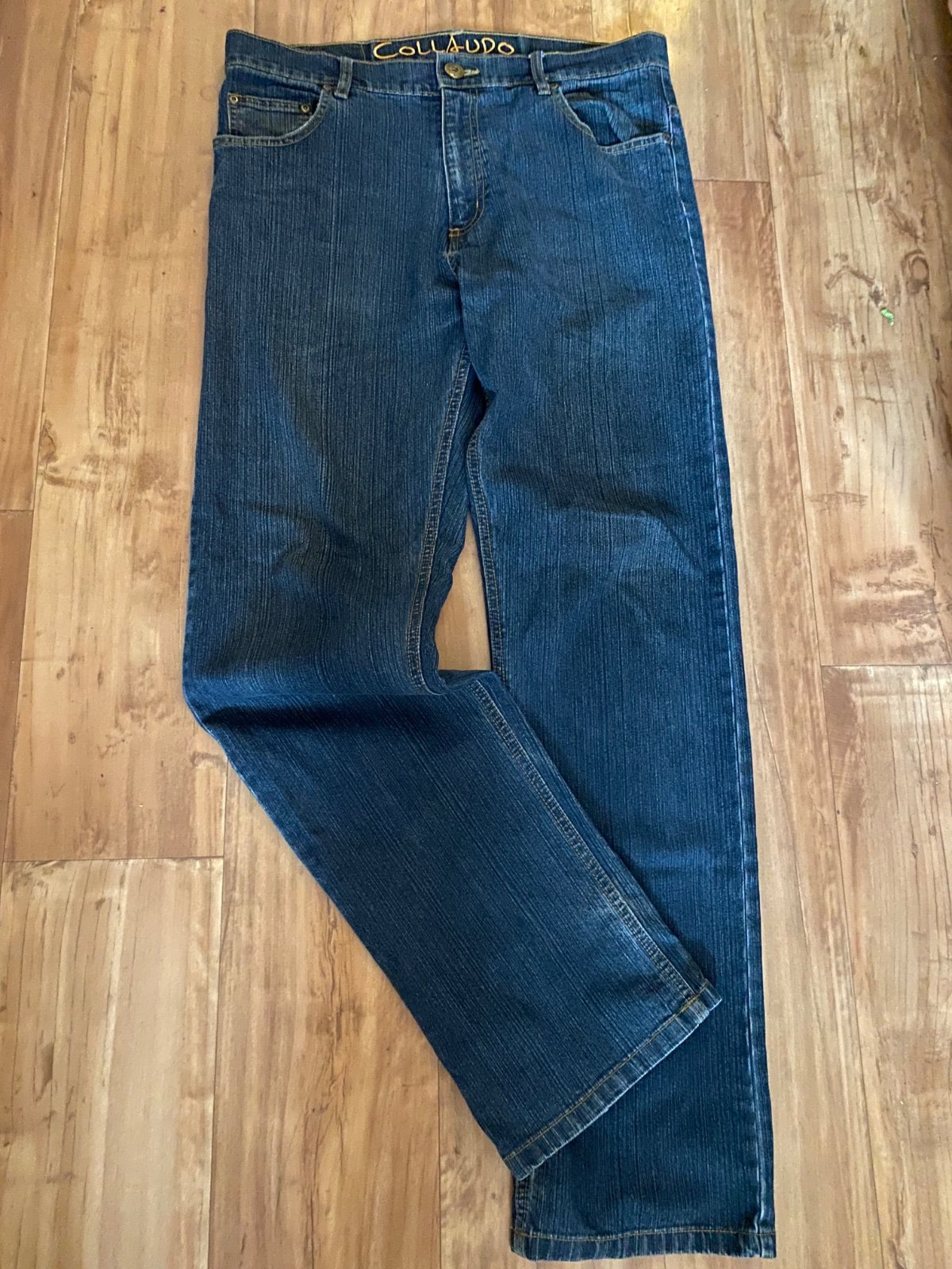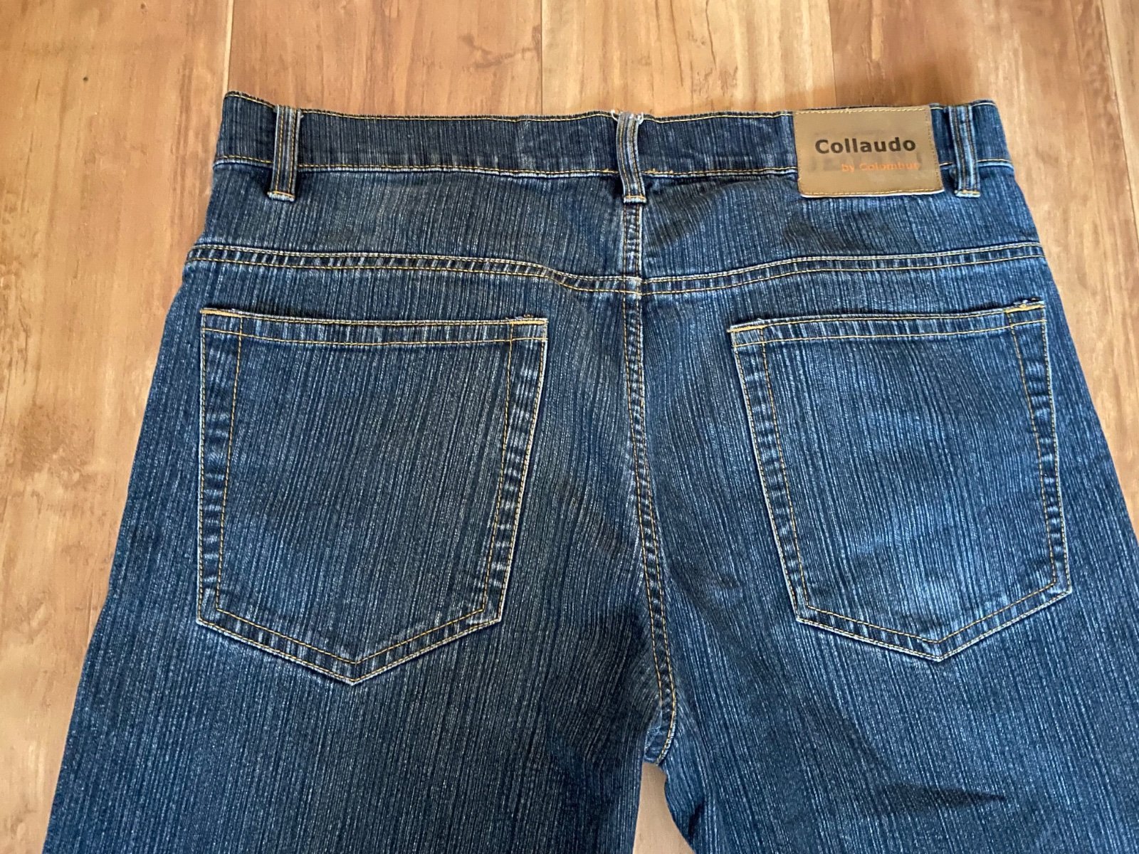 Elastické džíny, bavlna, elastan, bez vady.. UK-28 Rozměry: dél.-97cm,,,vnitř.d.-77cm,,,dél.sedu-29cm,,,pas-2x38cm,,,boky-2x44cm,,,š.noh.dole-2x23cm,,, Velikost: S Značka: AMISU