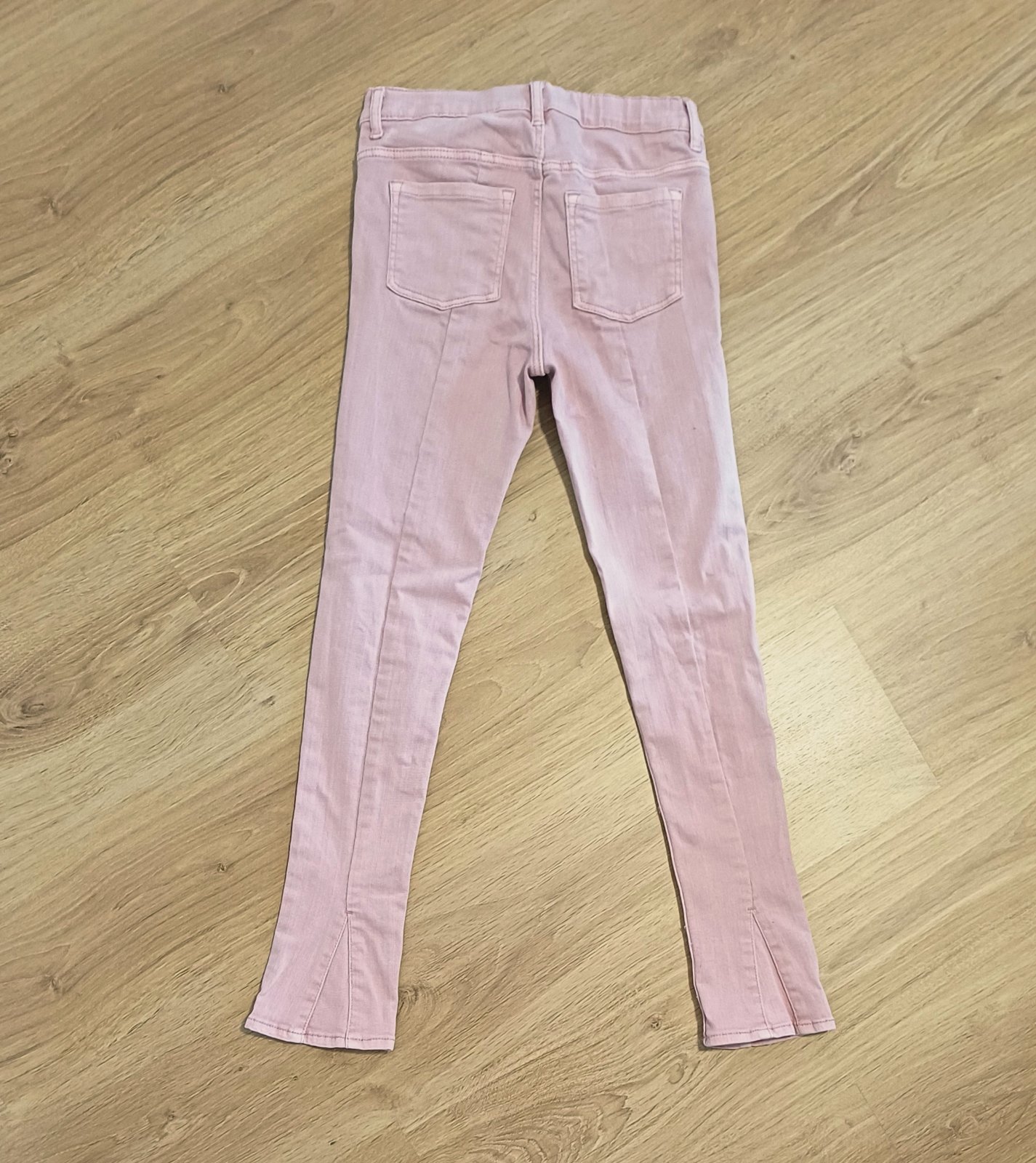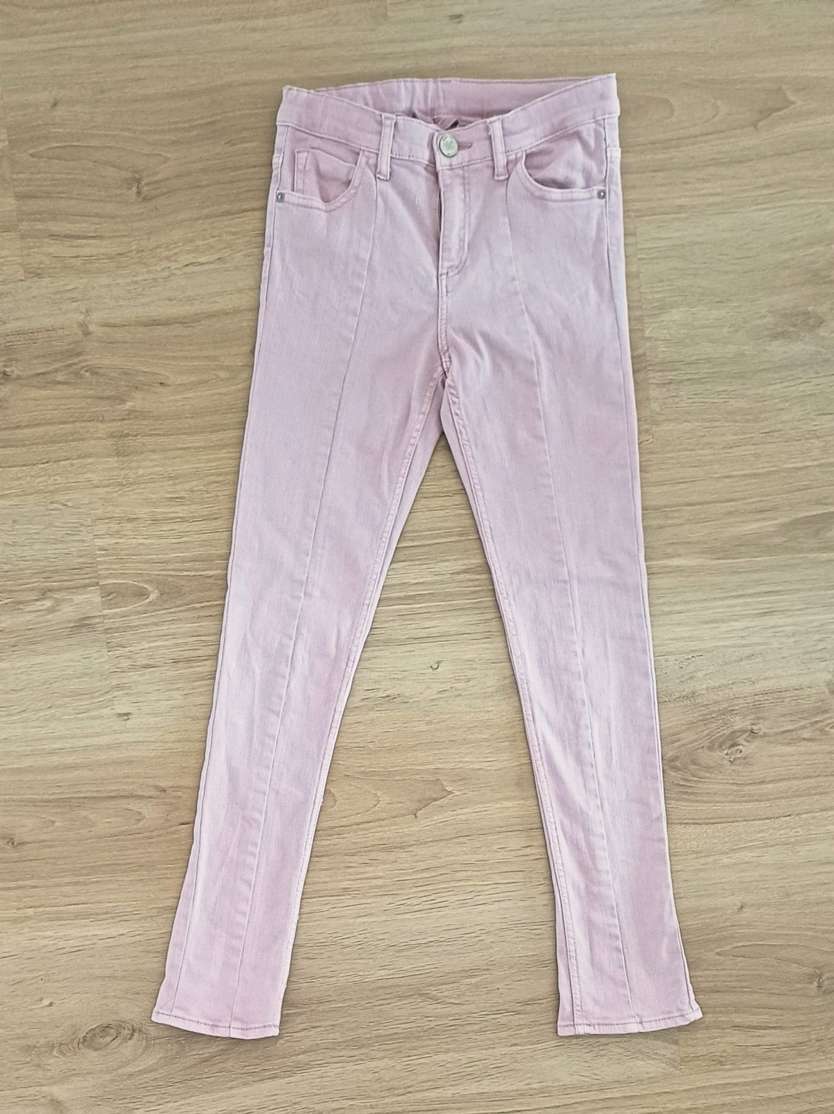 Moc pekne, ruzove dziny. Bez vad, na paradu. 97% bavlna, 3% elastan. V pase regulace. Delka 82, vnitrni 60, pas v klidu 28,5.