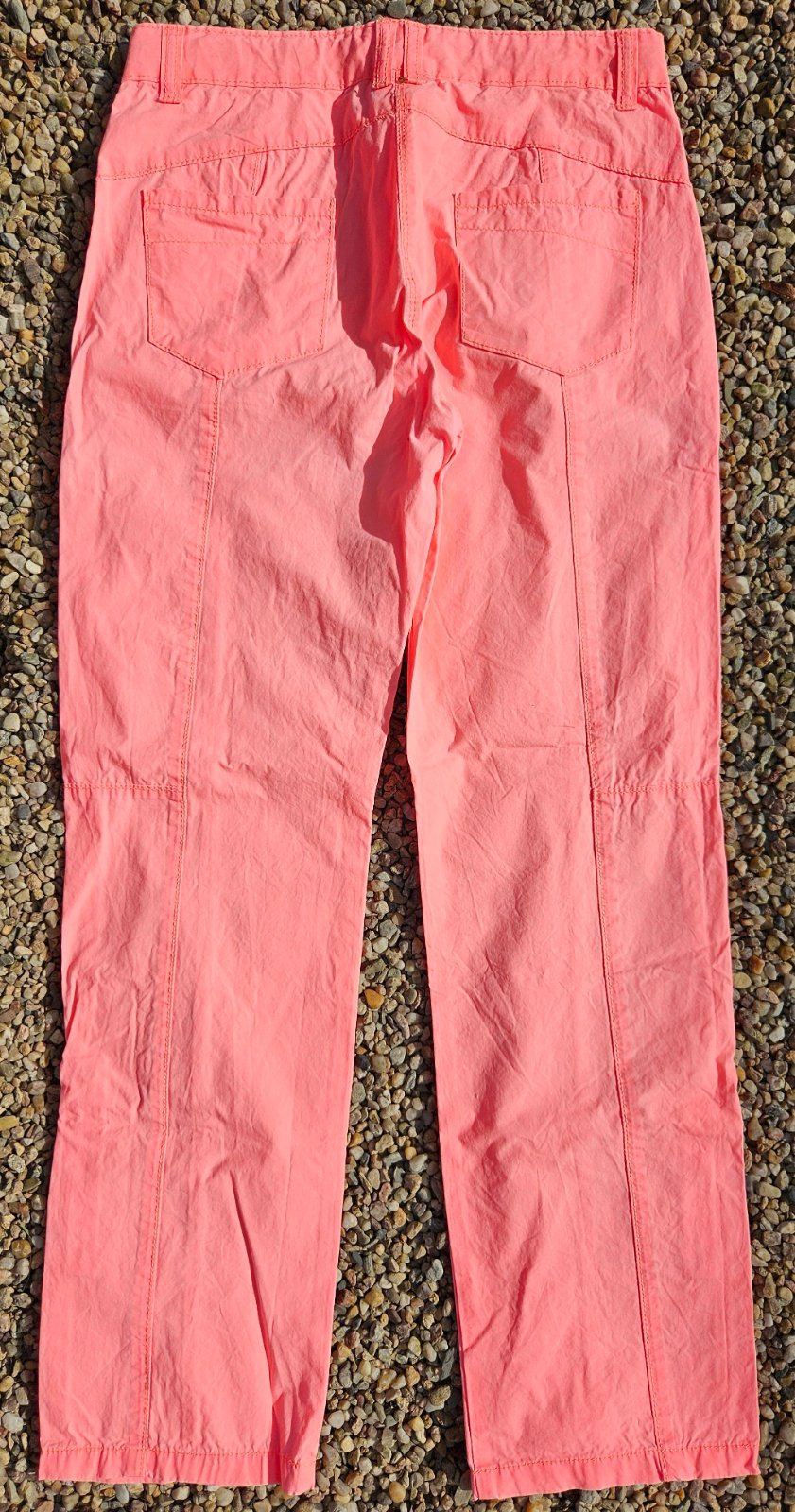 TOP stav, lehké, vhodné jaro/léto, s možností rolovat na 3/4. V pase regulace, poutka pro pásek, nejsou podšité. Barva svítivě růžová.