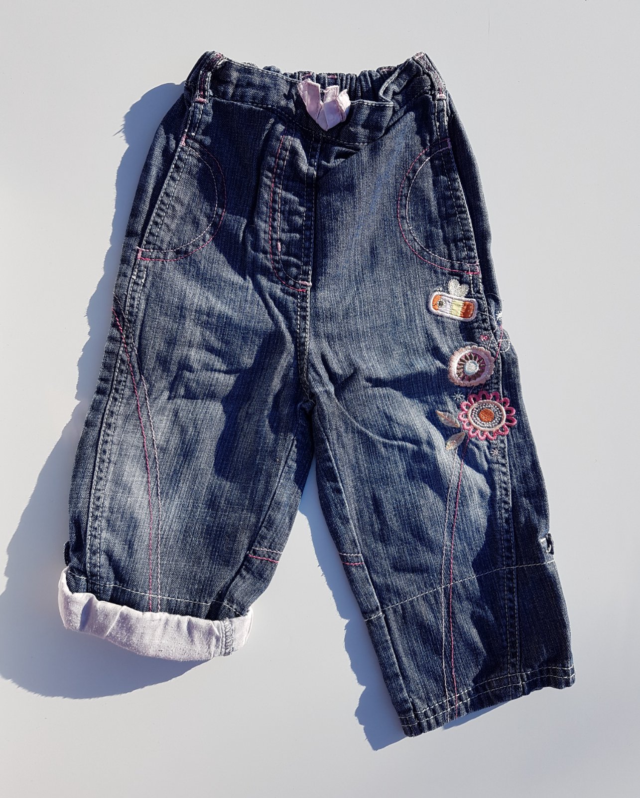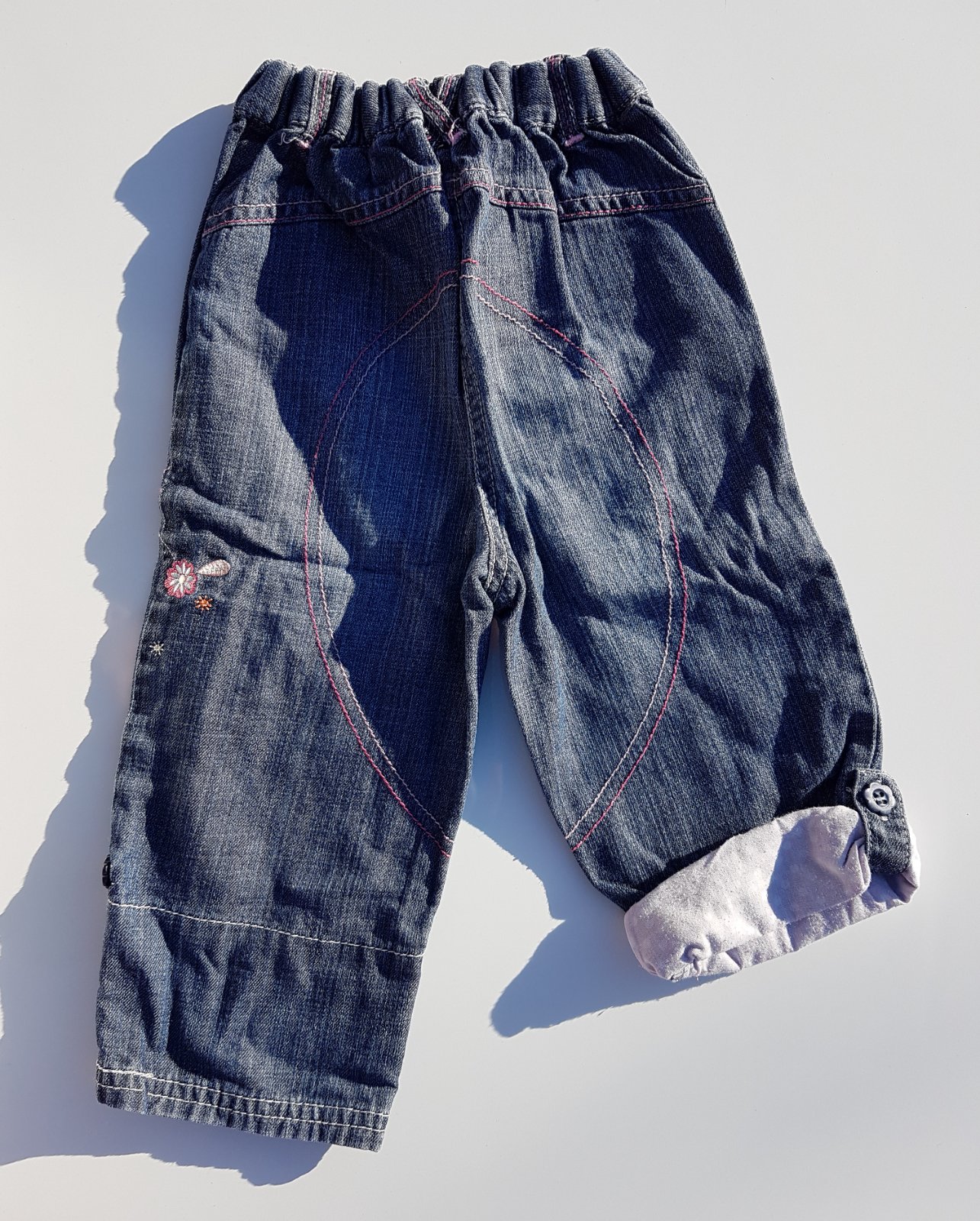 z tenčí rifloviny, vzadu v pase guma, ozdobné kontrastní prošití švů, vyšité obrázky, pod ohrnovací částí podšité bavlnou, velmi slušivé