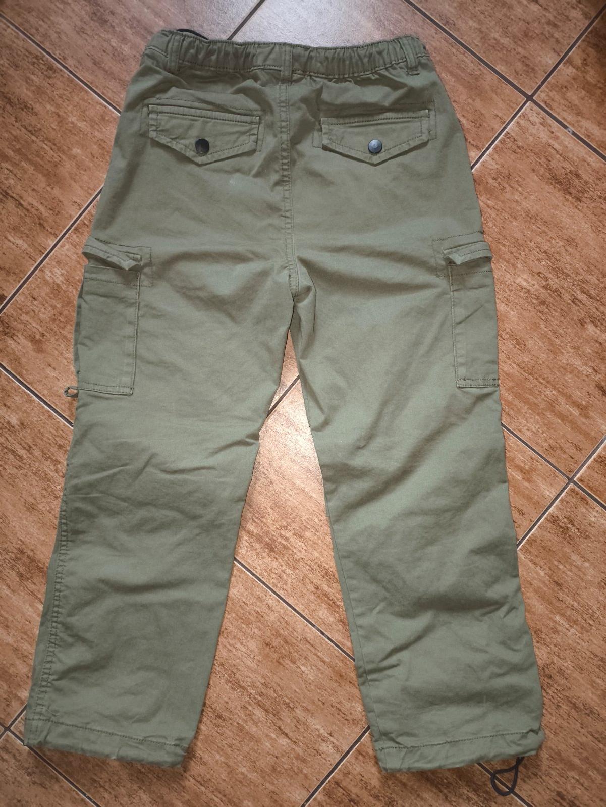 Kalhoty z bavlněného kepru. Úzký střih, nastavitelná guma v pase. 100% bavlna Výborný stav. Nošené velmi málo, rychle z nich vyrostli. Délka 78 cm.