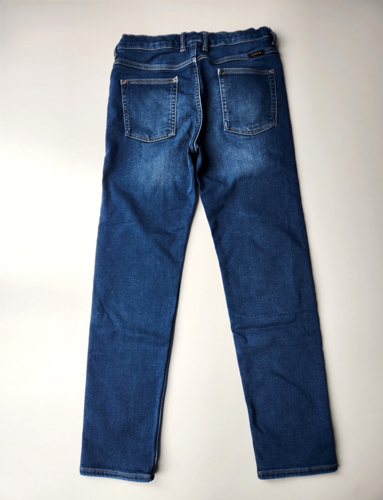 Modré pružné džínové kalhoty zn. H&M, knoflík, ozdobné tkaničky, poutka na pásek, v pase regulační guma, přední a zadní kapsy s kovovou peckou.