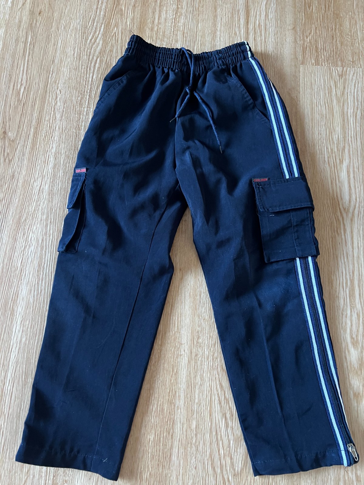 Tmavě modré tepláky po 1 synkovi, trošku žmolíčky. Velikost 122/128. Šířka v pase 25 cm, délka 71 cm. 20% polyester, 80% bavlna.