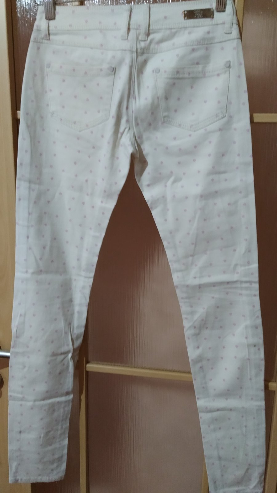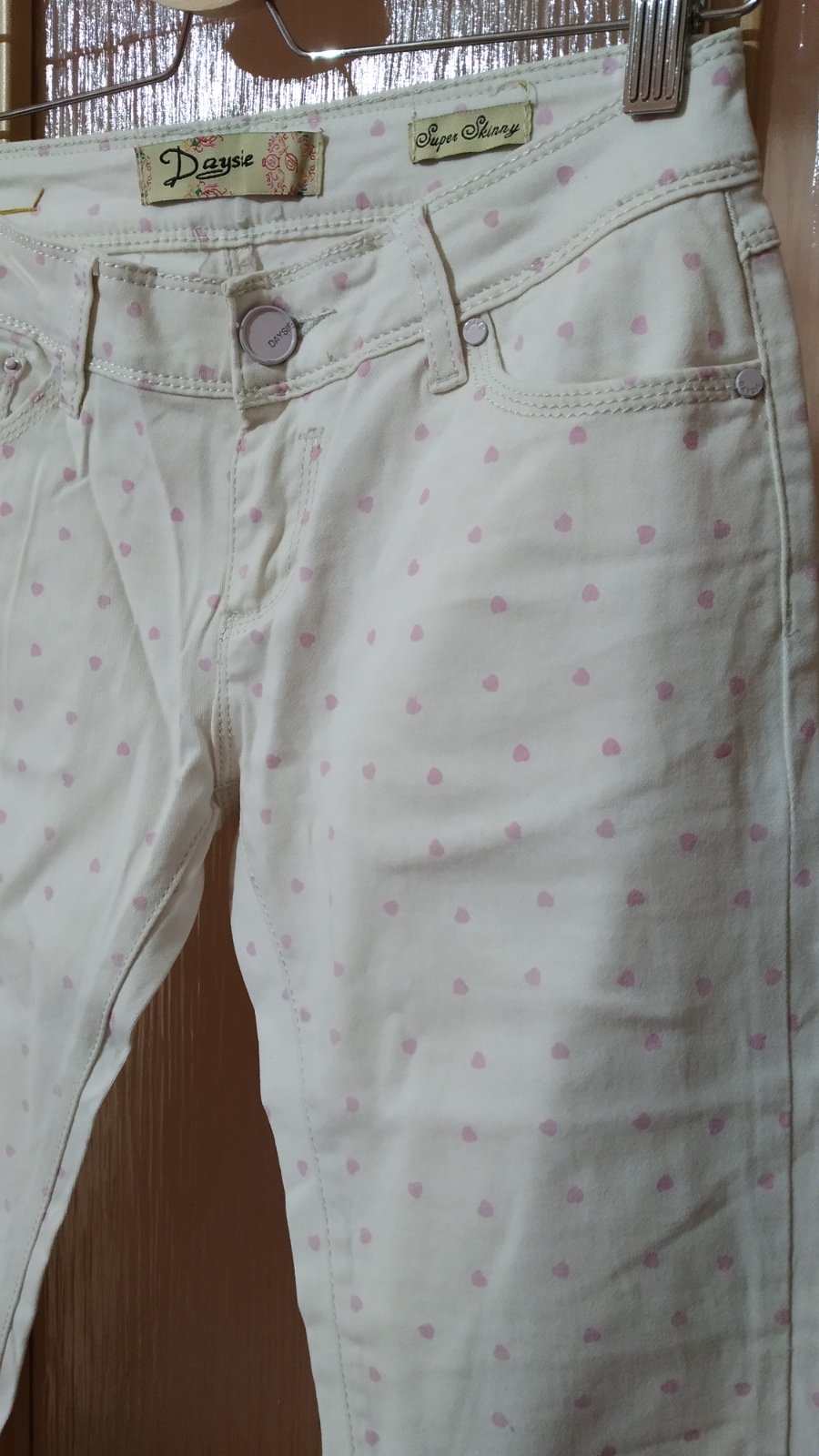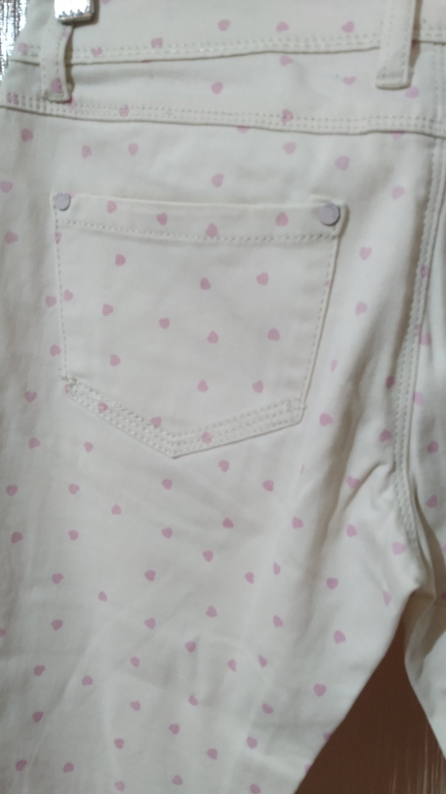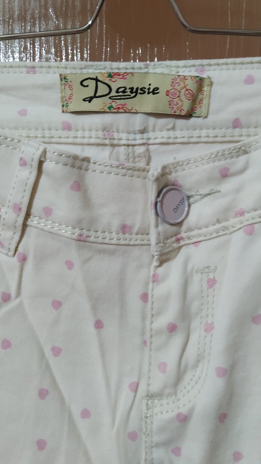 Krásné letní elastické kalhoty ve 100% stavu, Krémová barva, malá růžová srdíčka, Uvedena vel.38, spíše 36, měřte. Pas 35cm, př.sed 19cm, z.sed 29cm, vnitř.délka 81cm.