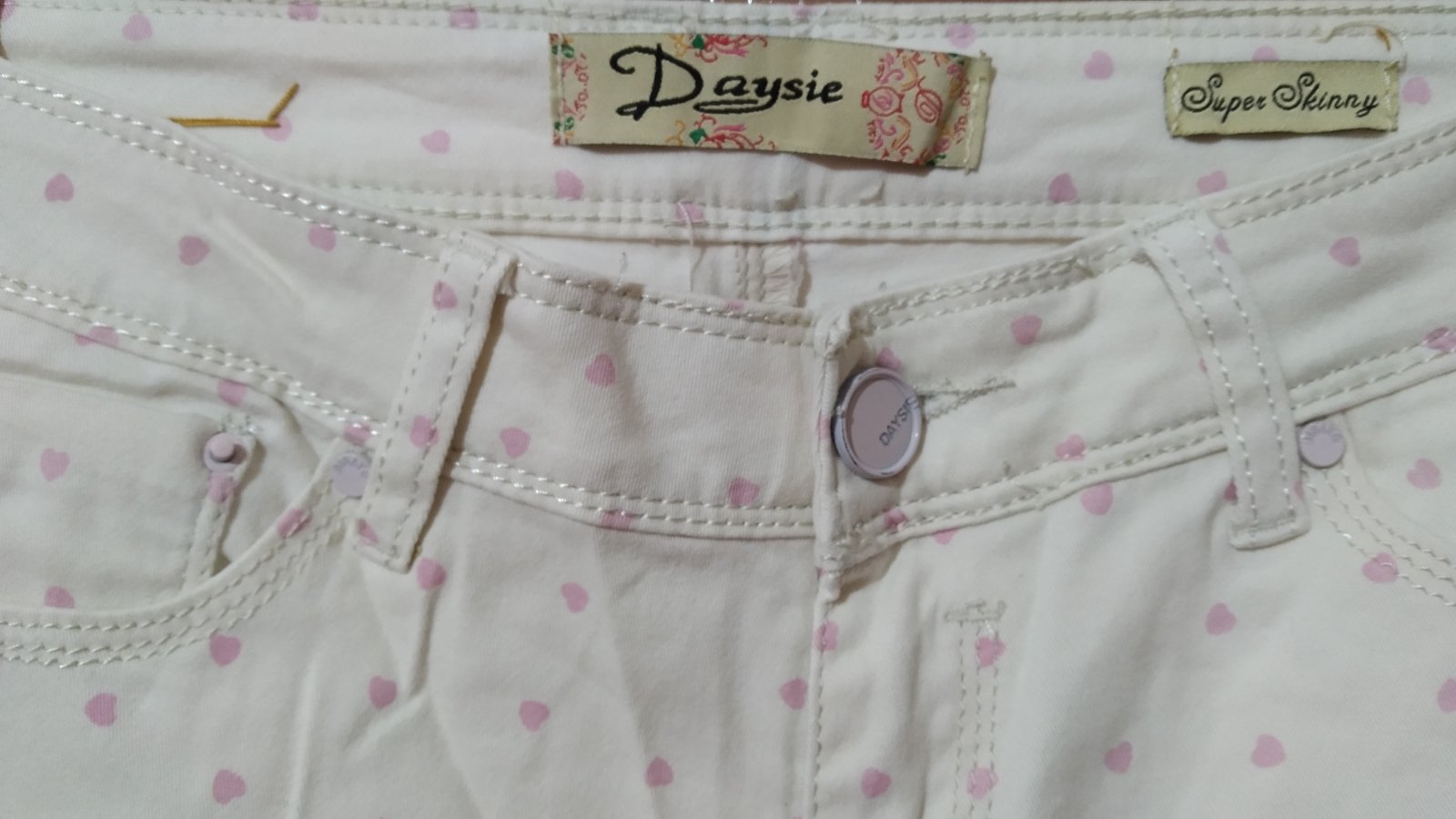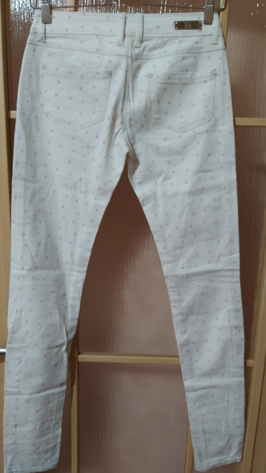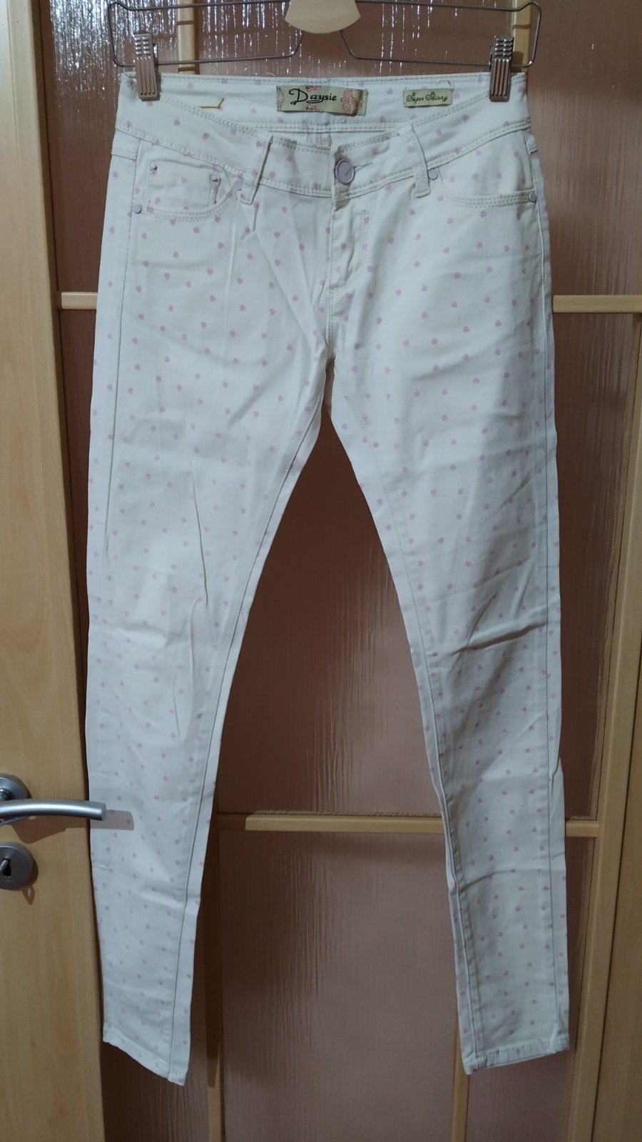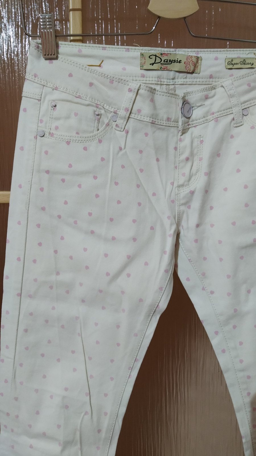 Krásné letní elastické kalhoty ve 100% stavu, Krémová barva, malá růžová srdíčka, Uvedena vel.38, spíše 36, měřte. Pas 35cm, př.sed 19cm, z.sed 29cm, vnitř.délka 81cm.