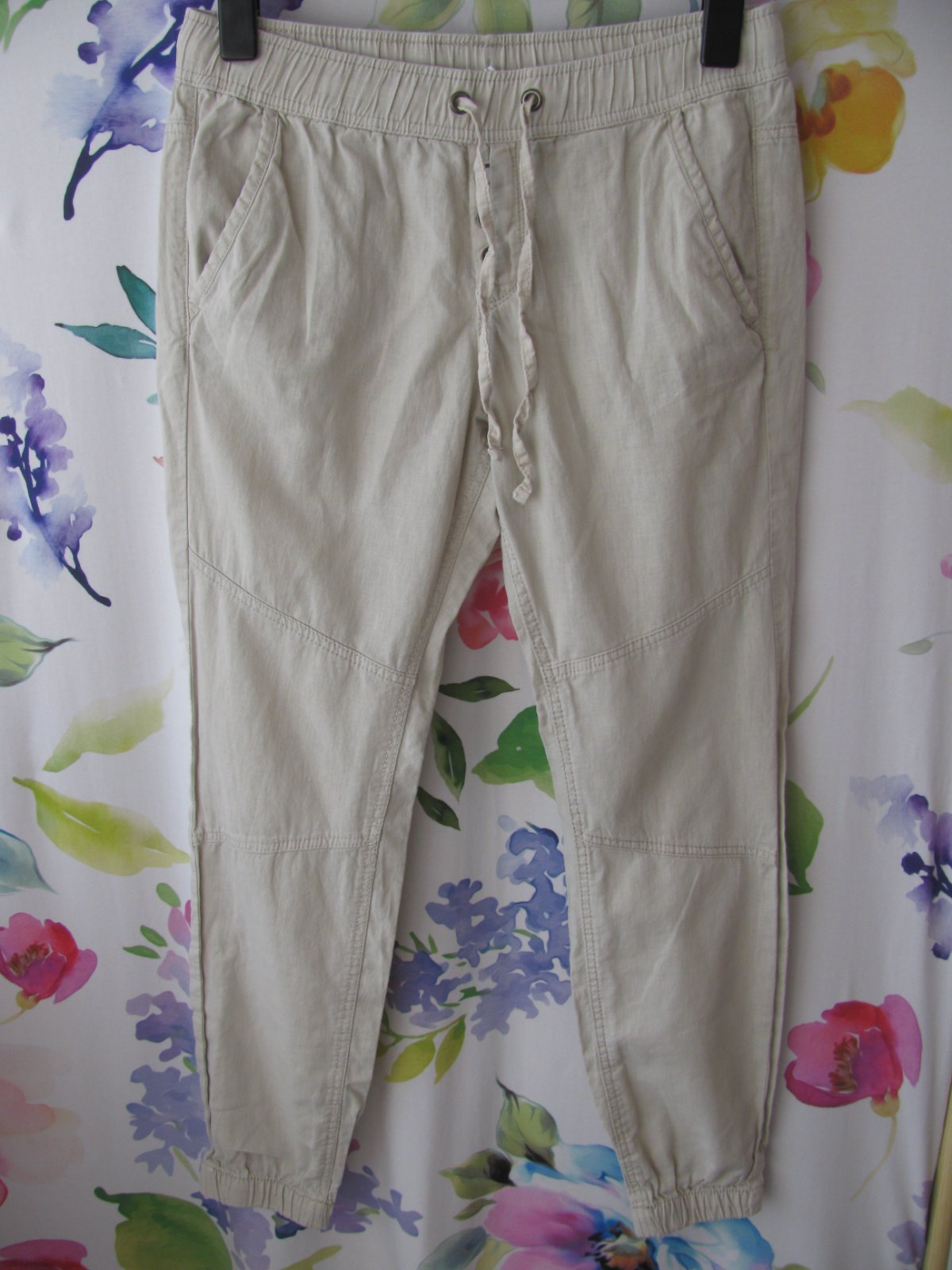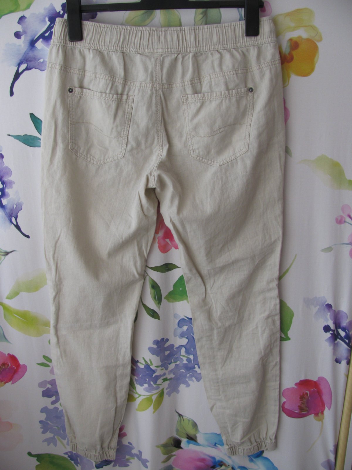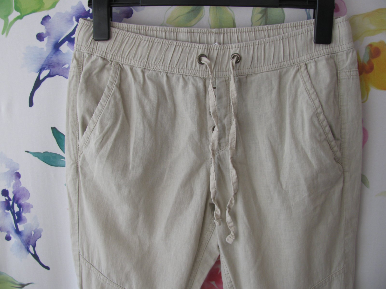 Skvělé lněné letní kalhoty, konce nohavic dole do gumy, v pase pohodlná širší guma a šňůrka, boční zadní kapsy, 55% len, ostatní nepřečtu. Top stav bez vady.