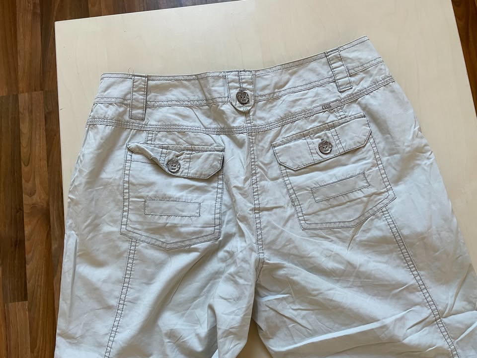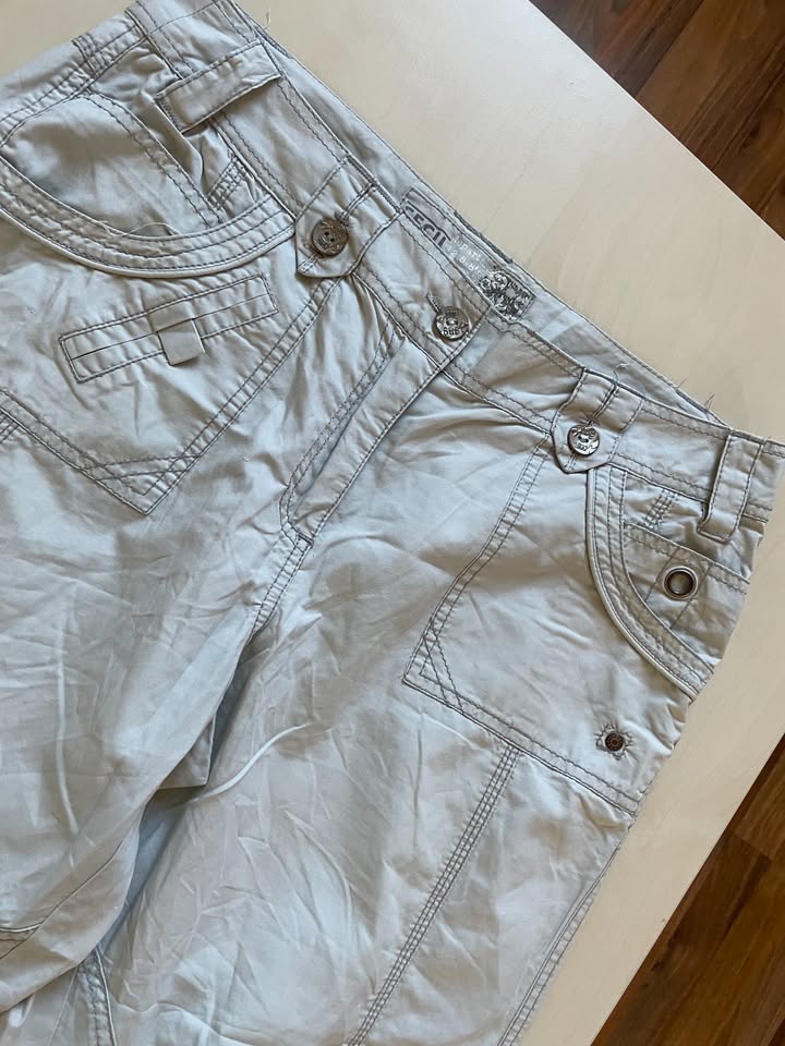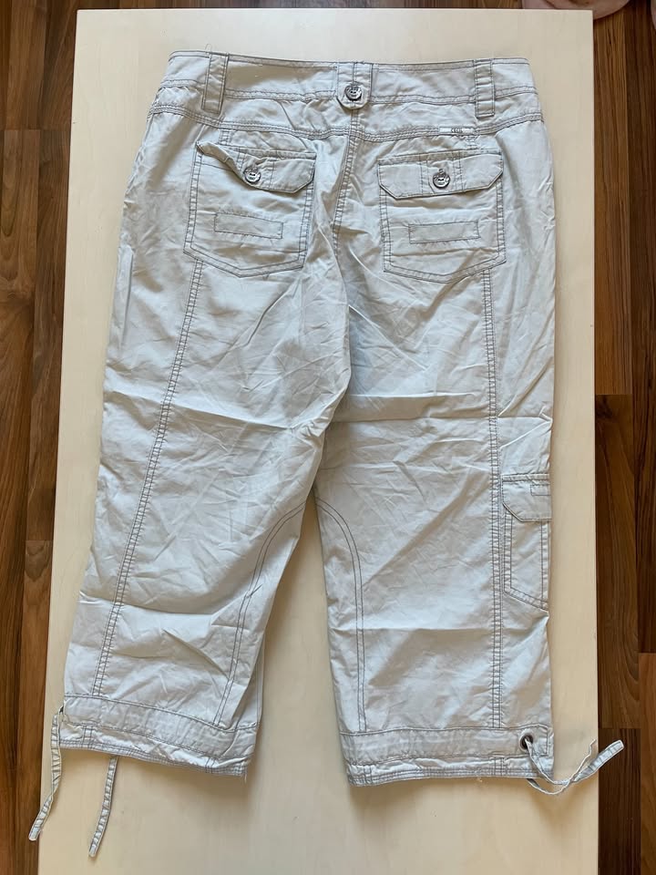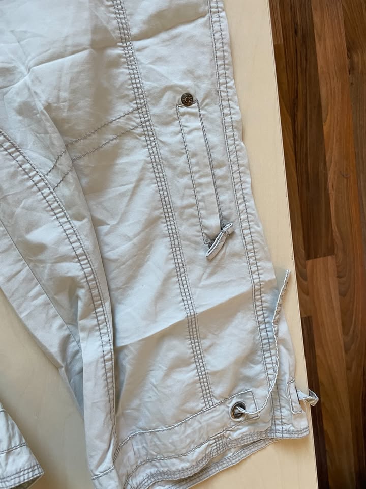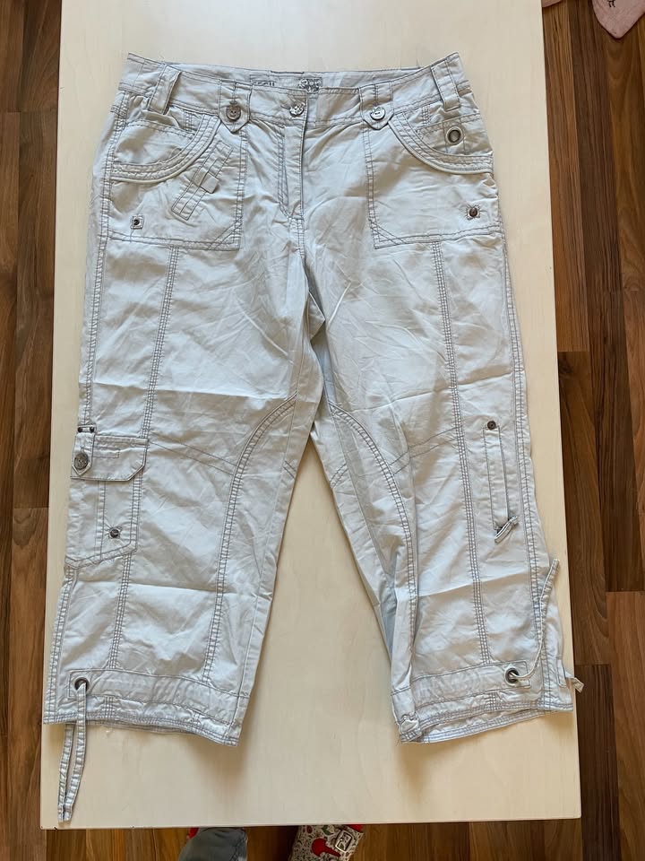 2834. nabízím k prodeji tyto 3/4 kalhoty s kapsami, vel 30, Cecil. Barva přírodní, studený odstín do šedozelena. Doplněné kapsami, zipy a provázky. Nošené, bez vad, krásné