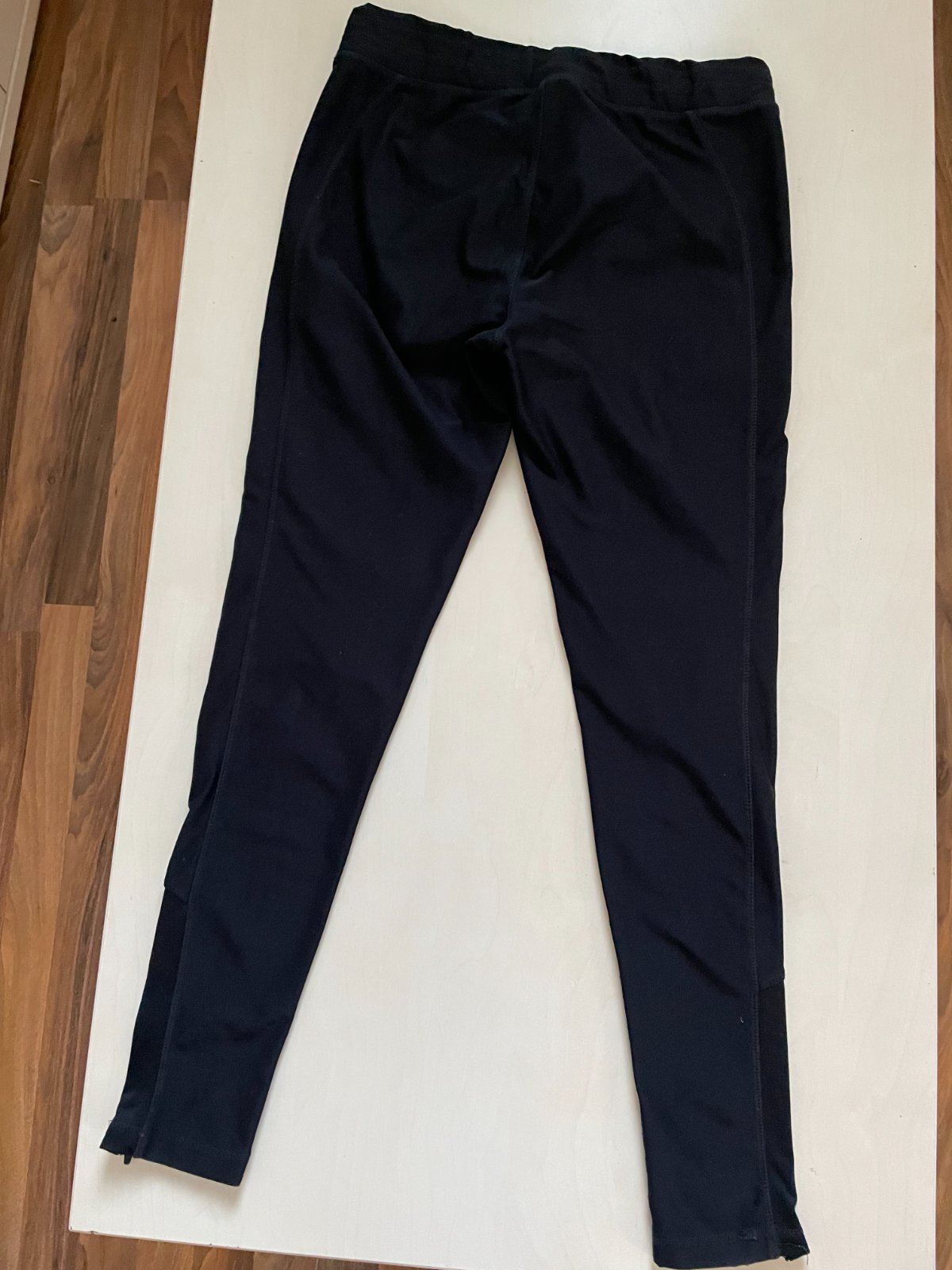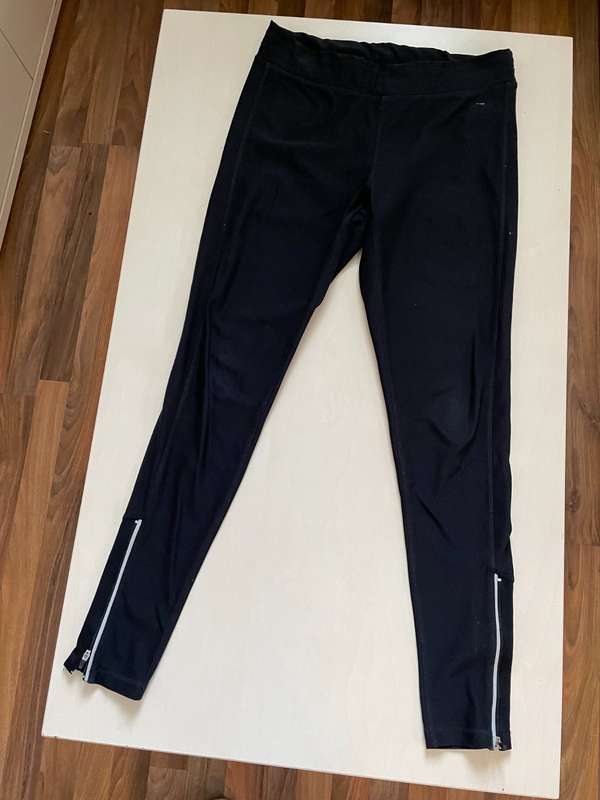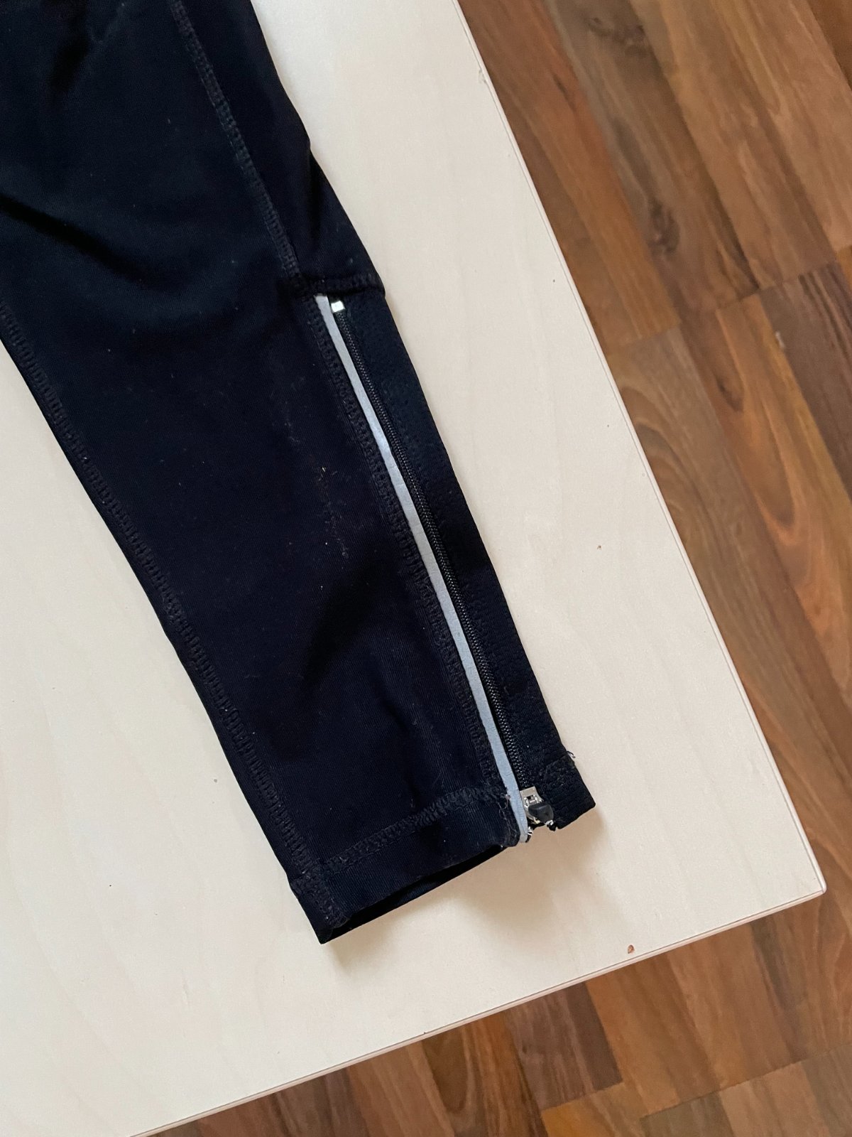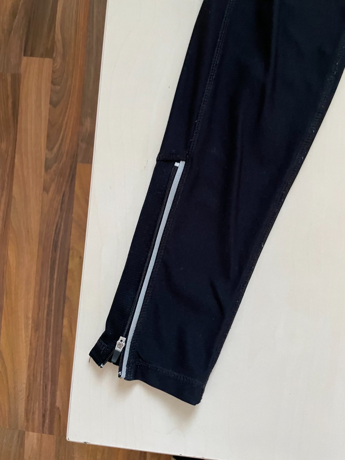 let. nabízím k prodeji tyto černé sportovní kalhoty / jako leginy, se zipy na konci nohavic. Materiál hladký, pružný, podobný jako funkční prádlo, nebo něco s lycrou - nejsou to vyložené leginy. Pas guma, silnější a ne moc pružná. Velikost S a 8-10. Materiál 88% poylester, 12*elsten. Konce nohavic zipy, podélně šedá /stříbrná lemovka - maličko prosklinky. Dále pak u pasu bylo logo a je oprané , zbyl jen zbytek toho potisku. Obojí nijak nevadí, službnu udělají a stále jsou krásné