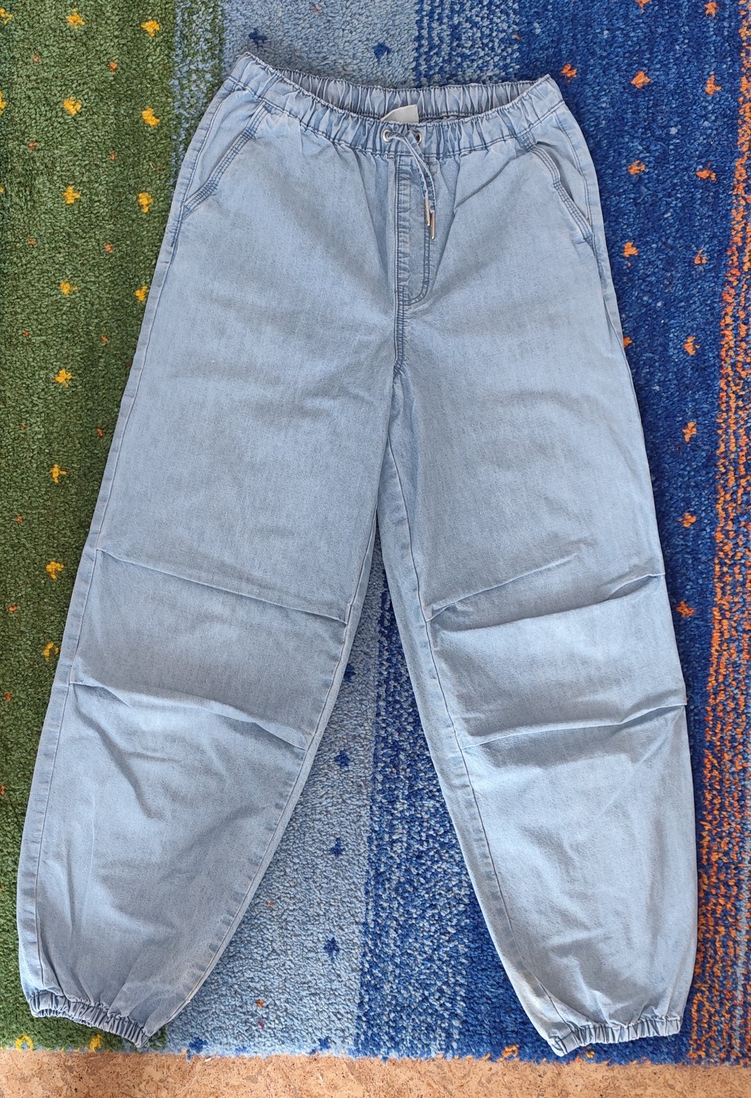 Modré plátěné kalhoty, riflový vzhled, široké, v pase a na kotnících na gumu. Z vnitřních stran dole málo viditelné nevypratelné zašpinění a na jedné nohavici mini prodřená dírka viz foto. Tyto vady jsou při nošení téměř skryty.