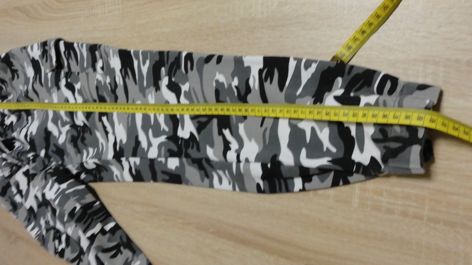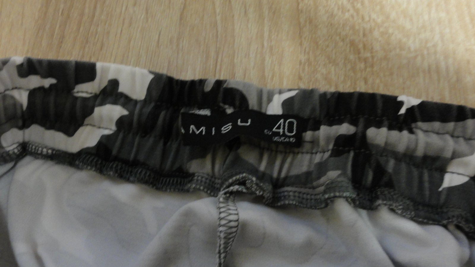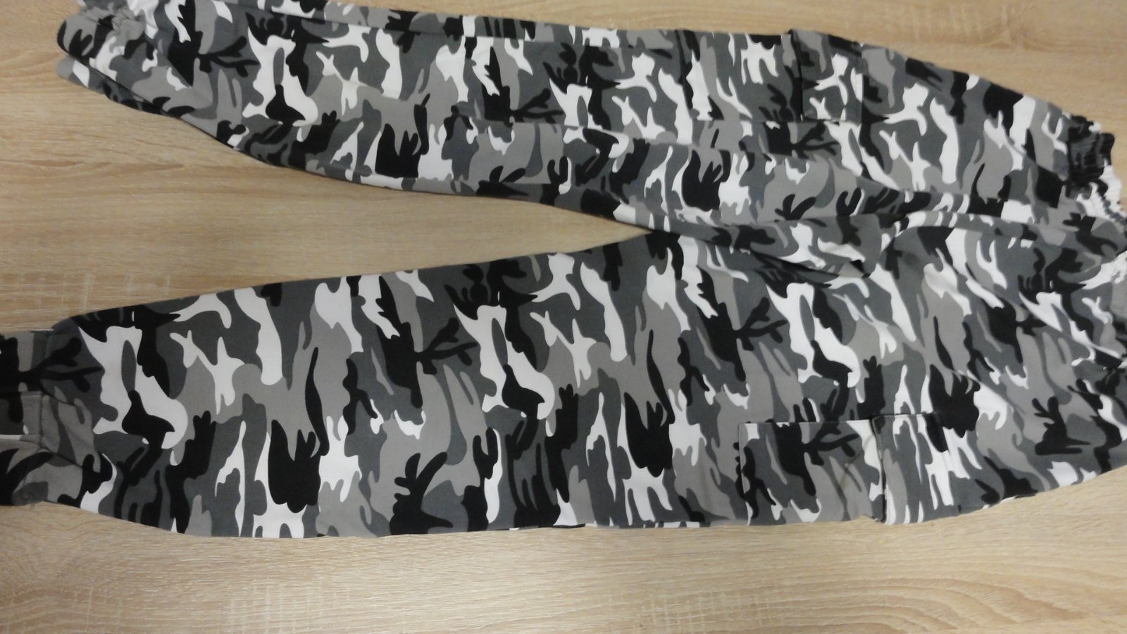 Tepláky velikost 40, maskáčový šedý vzor, v pase guma s tkaničkou na stáhnutí. Na boku kapsy. Spodní okraj tepláků do gumy.