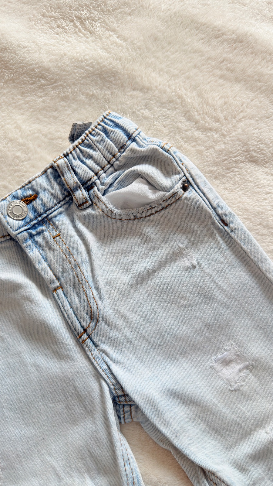 Džíny na kluka, užší střih, v pase regulovatelná guma, kapsy. Top stav. Vnitřní délka nohavice 34 cm, vnější 52 cm.