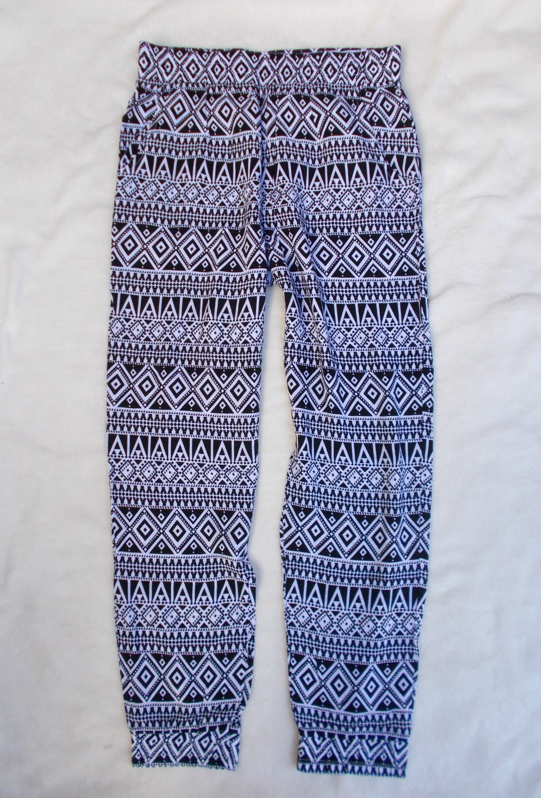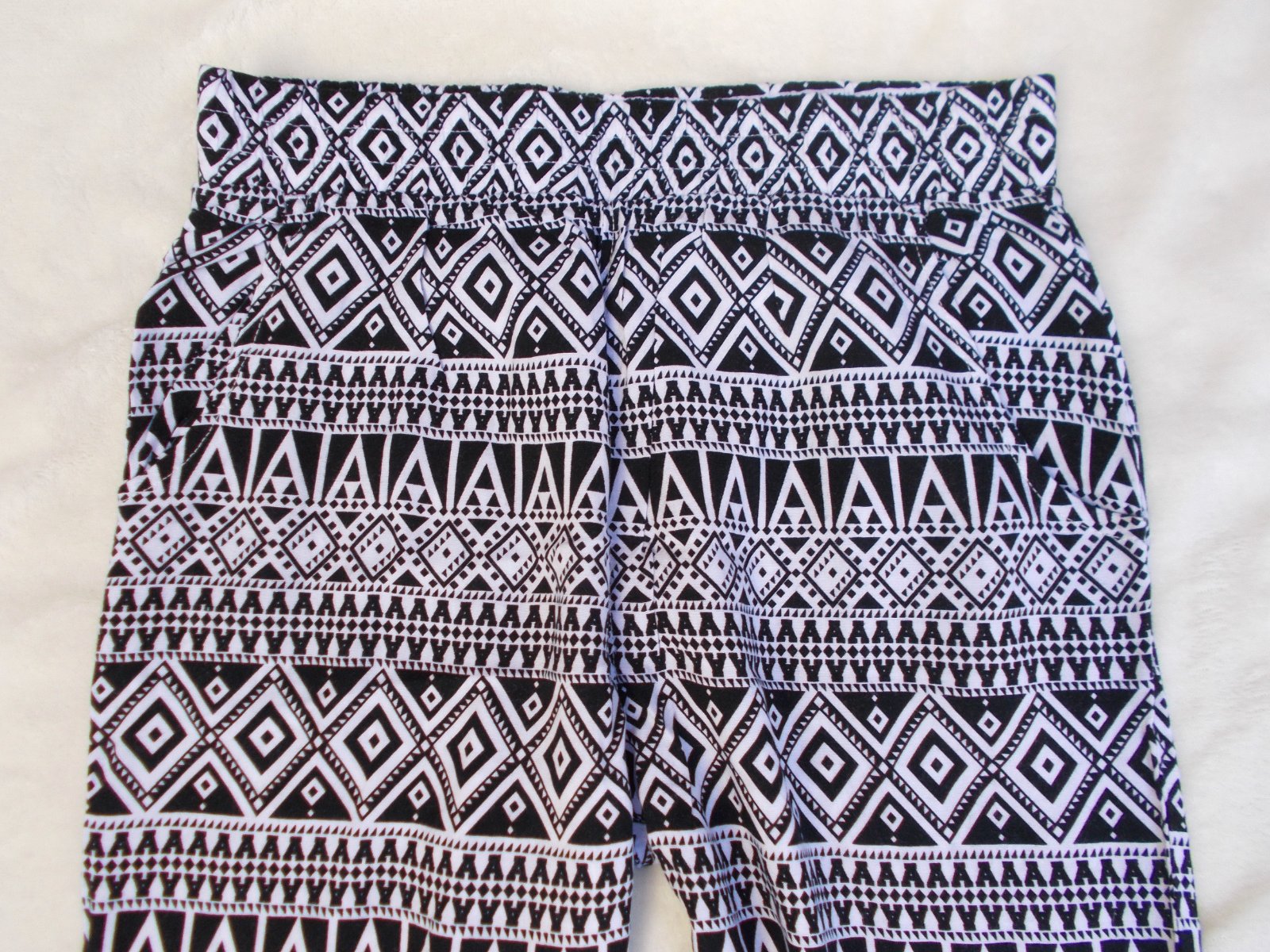 Krásné letní kalhoty v super stavu - jsou tenké, moc příjemné na léto. Bílo-černý geometrický vzor, v pase pohodlná široká guma, dvě kapsičky. Materiál - 100 % viskóza.