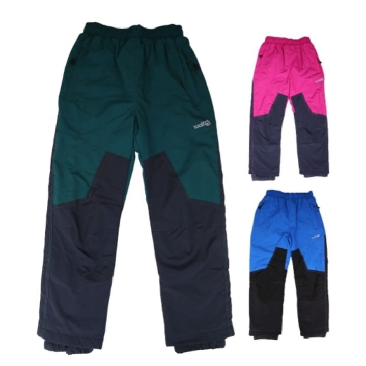 Dětské šusťákové kalhoty podšité flísem, nepromokavé, podšívka nežmolkující flís, dvě zapínací kapsy, v pase do gumy a šnůrky na stažení, dole v nohavici vsadka, která zabrání vniknutí sněhu.