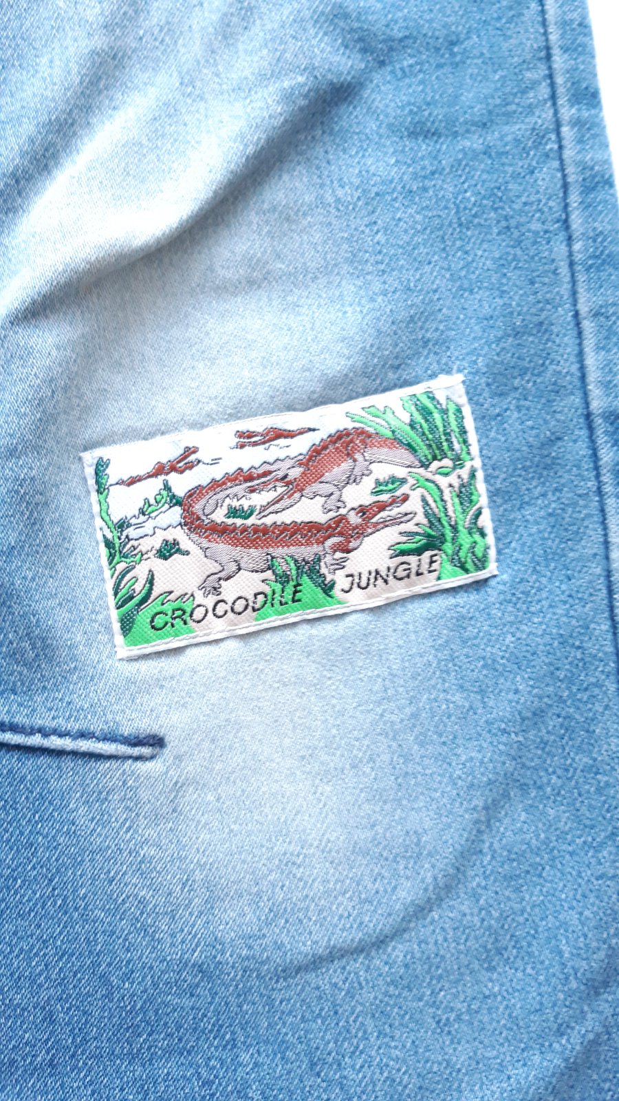 Chlapecké měkké džíny, nošené, prasklé na koleni, zašité se záplatou.