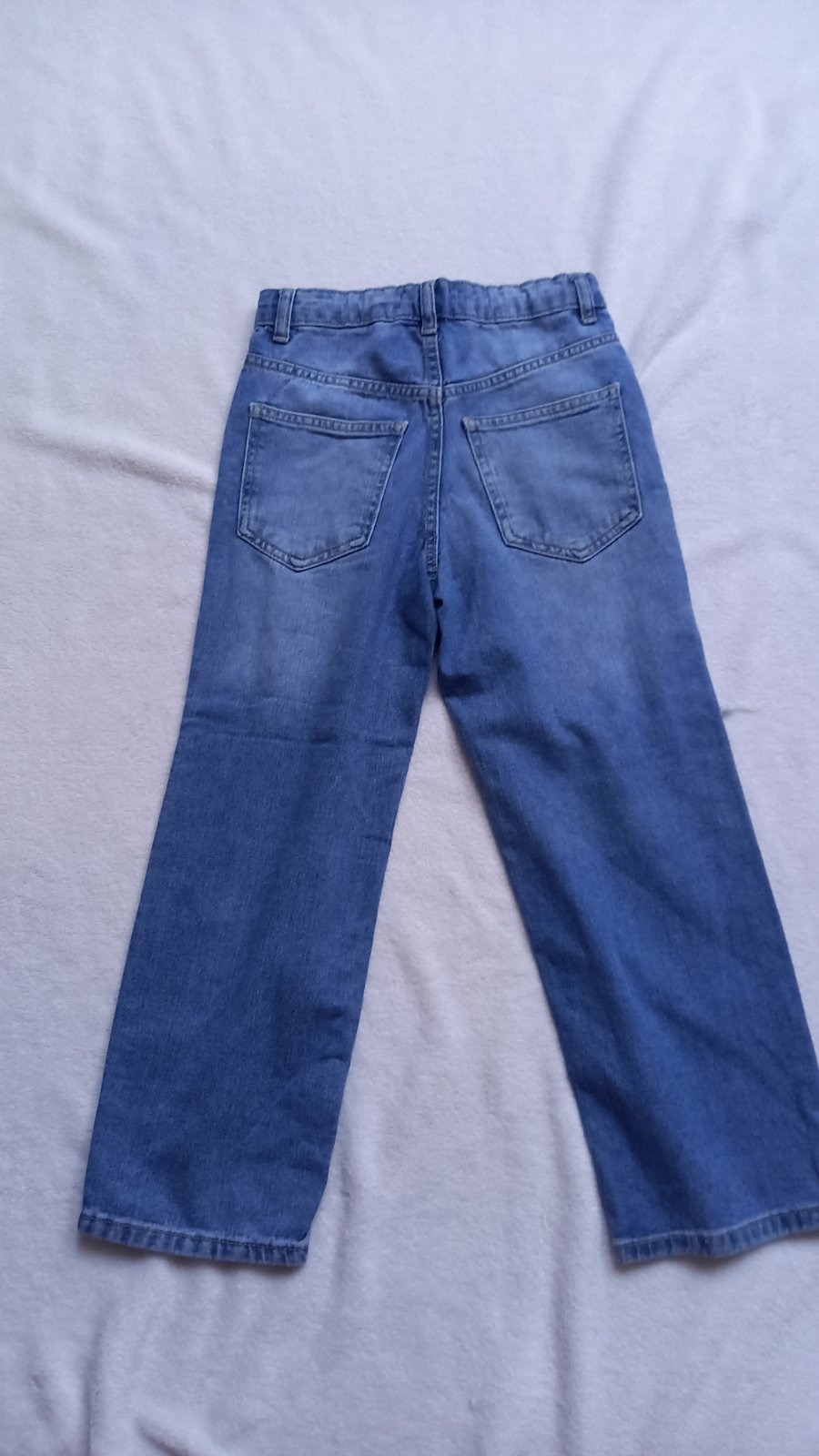 Rifle Lindex vel 134. Otrhané konce nohavic. S regulací v pase, na knoflík. Po jednom dítěti, bez vad. Rozměry: Celková délka 73 cm Vnitřní délka nohavic 54 cm