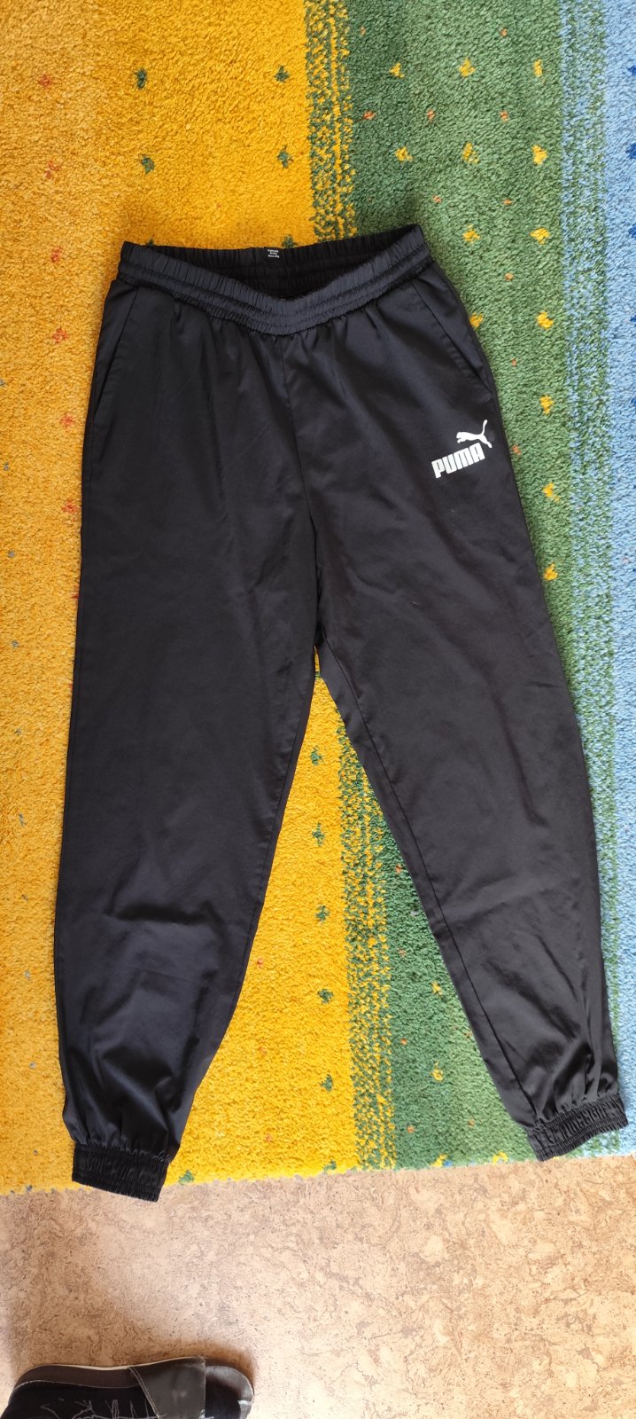 Šusťáky PUMA vel. 164 – tenké bez podšívky, spíše o číslo menší. V pase i na nohavicích na gumu. Mají několik flíčků (na fotce jsou s bleskem nápadnější než ve skutečnosti).