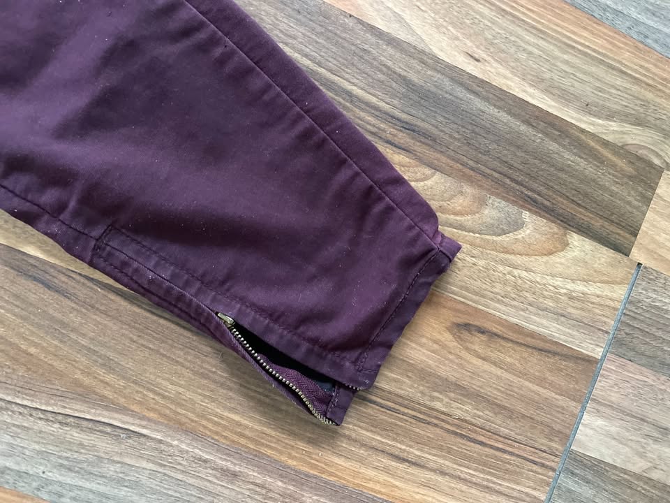 1319. nabízí k prodeji tyto tmavě vínové/ do bordo kalhoty/džíny, vel 34/XS, /mex24/, Pull and Bear. Na koncích nohavic zipy, materiál něco mezi plátěnými a džínovinou. Lehce pruží. Nošené, bez vad, krsáné