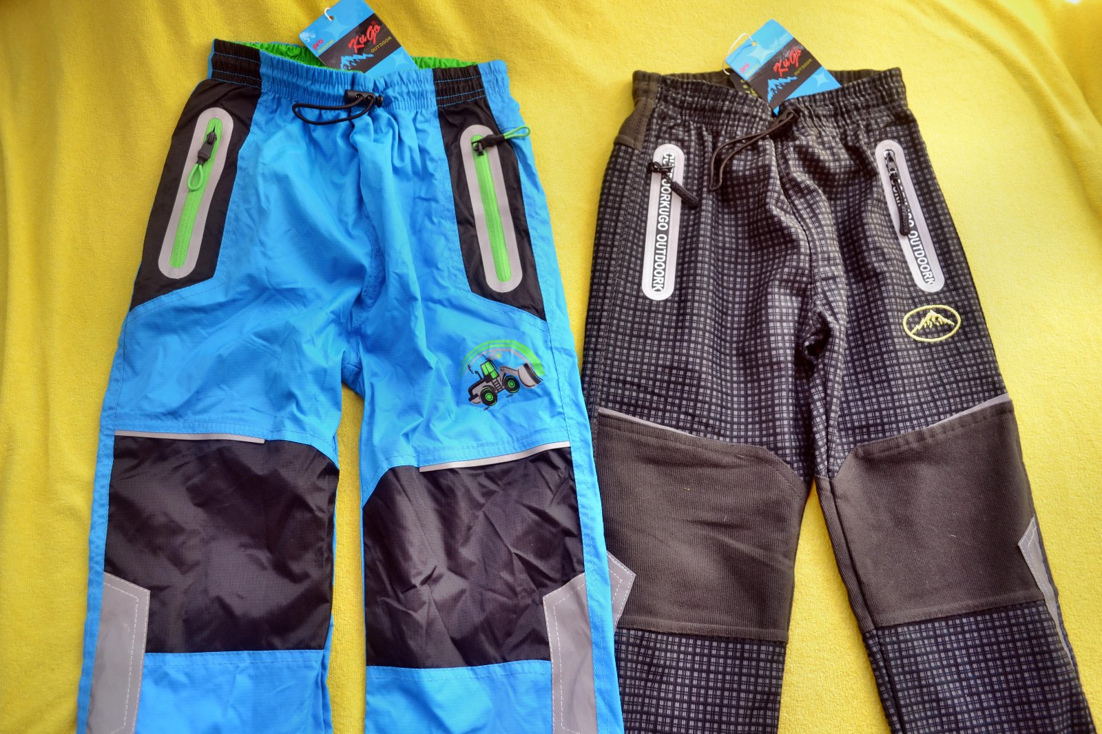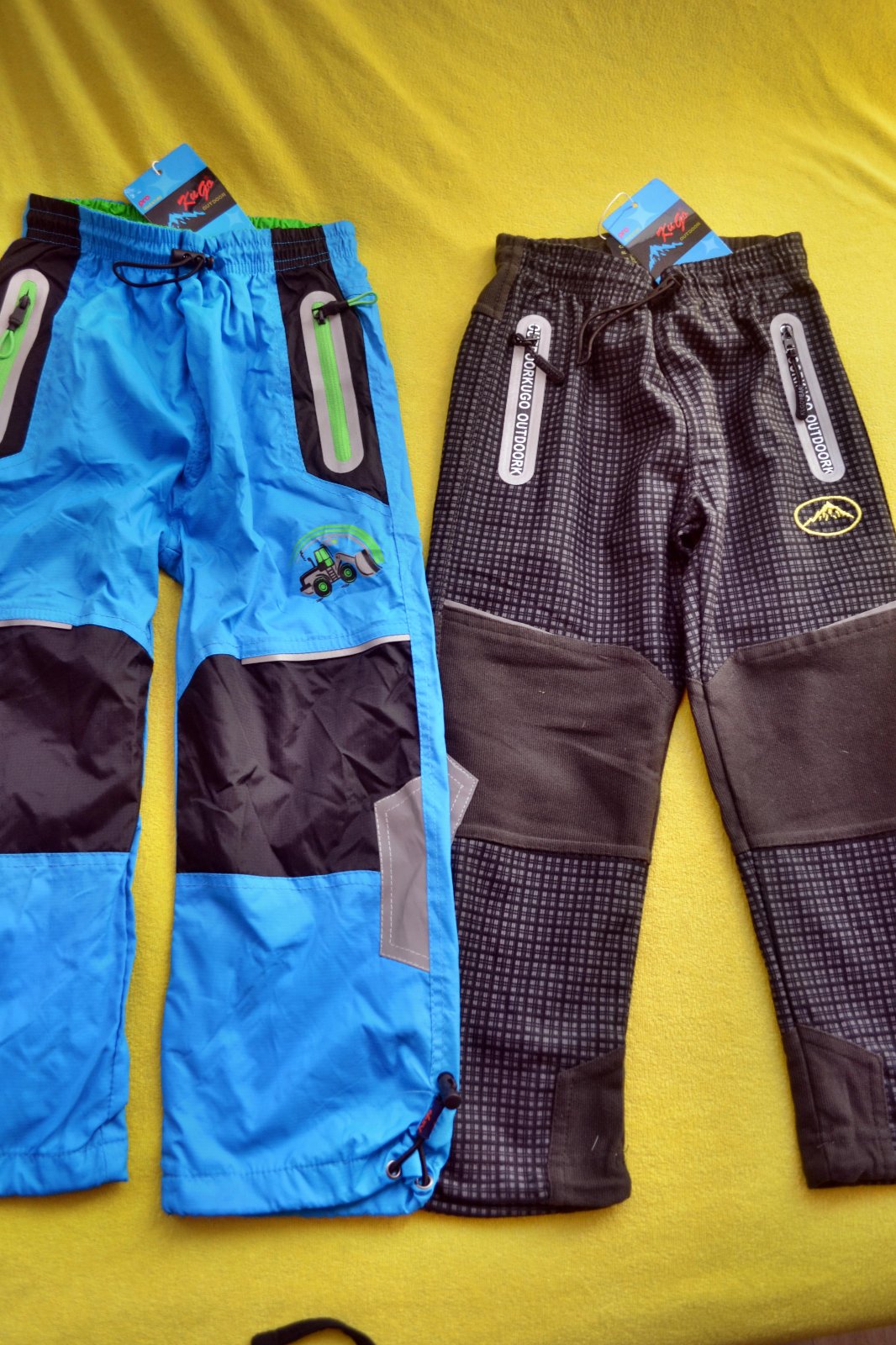 2x kvalitní nové sportovní jarní kalhoty šusťák a bavlna,v pase na stažení, kapsy,v.98/104, zn. Kugo,cena celkem za oba kusy