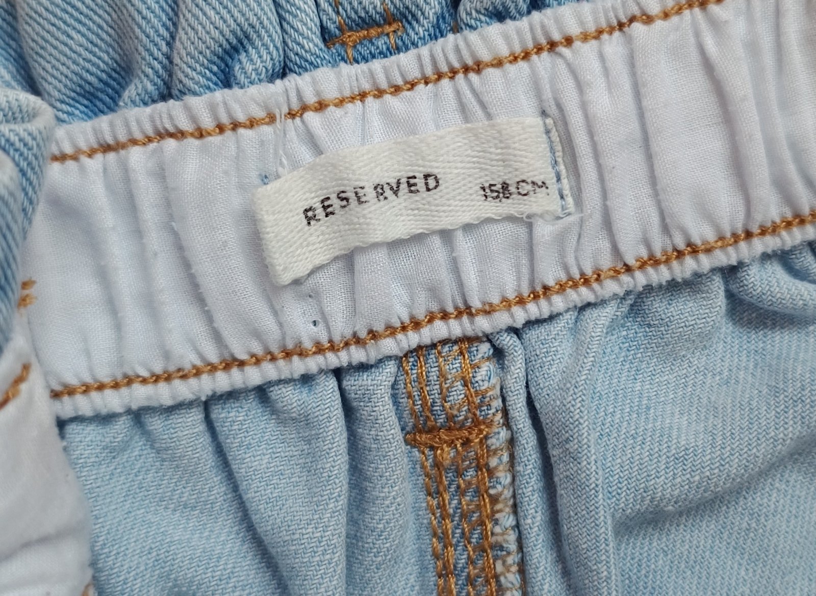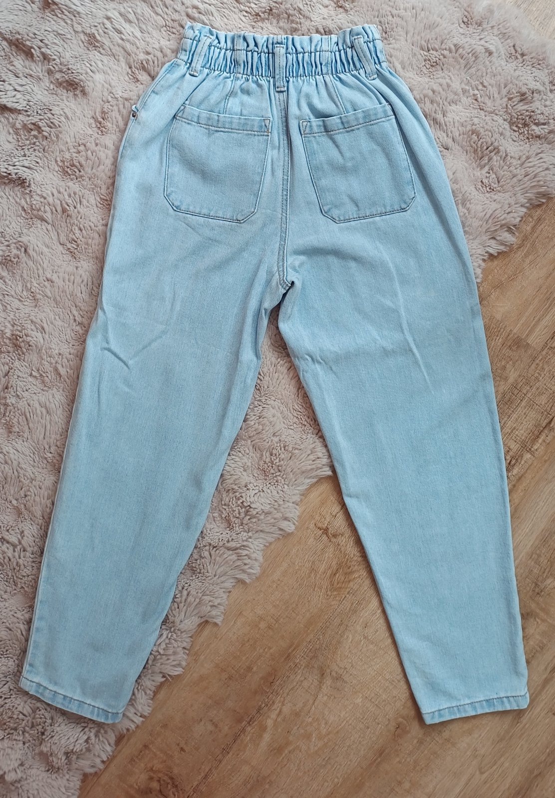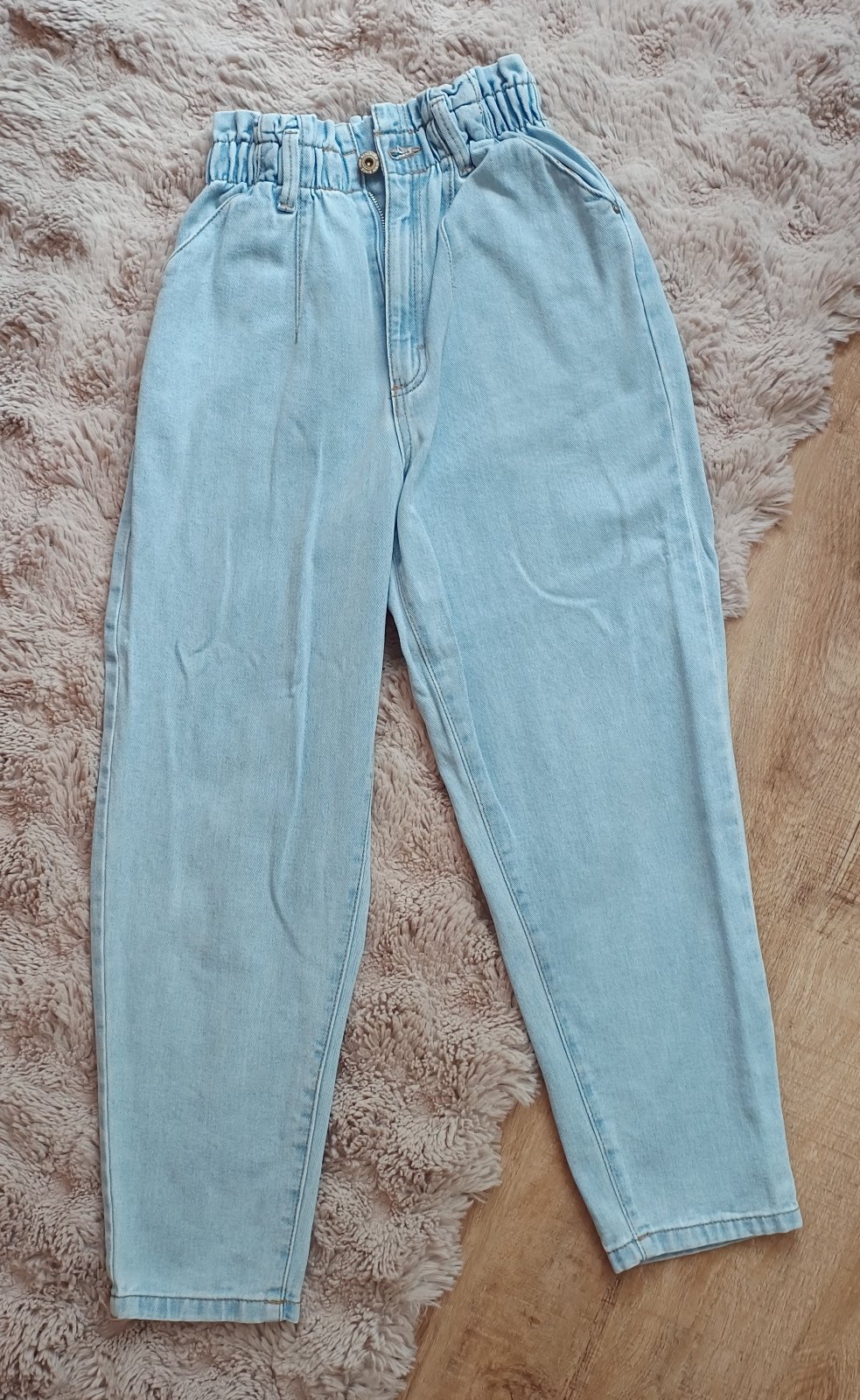 1x oblečené rifle, jako nové bez vad. Celková délka 95 cm, vnitřní strana nohavice 63 cm, pas po natažení až 2x 49 cm. Kalhoty krásně sedí, díky všité gumě v pase.