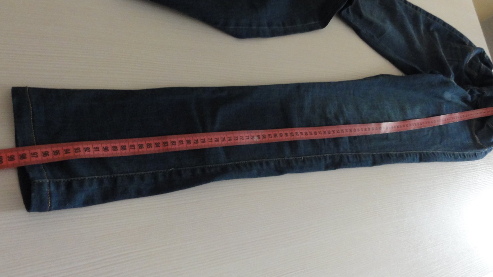 Inkoustové, lehce drbané, bavlněné džíny, pouze 1x prané, rovný střih nohavic, nášivky s logem, zdobné kapsy s nýty, pas na kovové knoflíky s logem, d. 104,5cm, od rozkroku dolů 77cm, š. nohavice d...