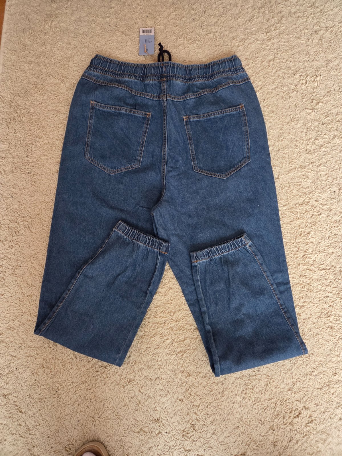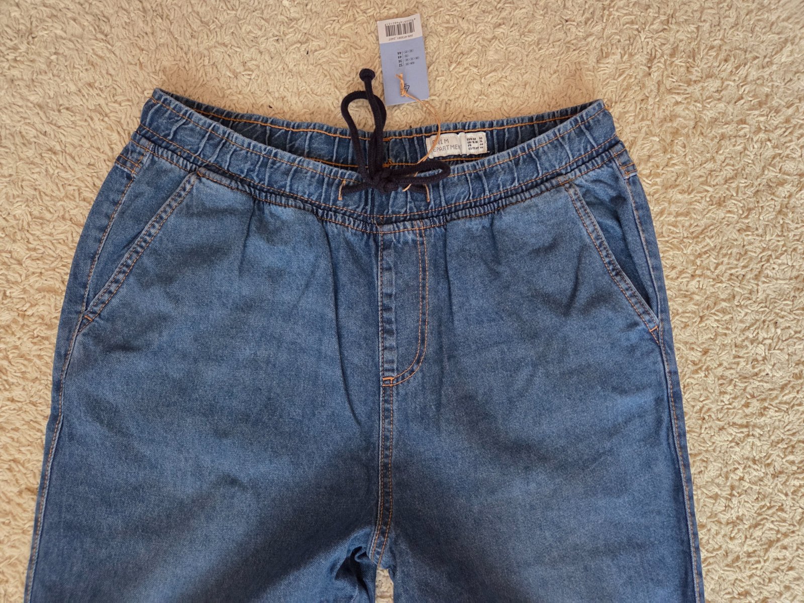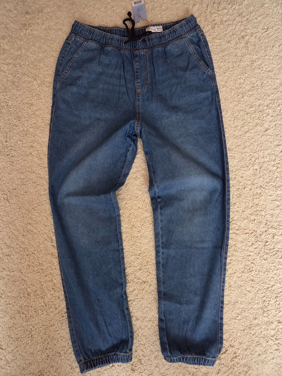 Vzhled džín - pohodlí tepláků. Postranní kapsy, zadní kapsy, elastický pas a šňůrka na zavazování.