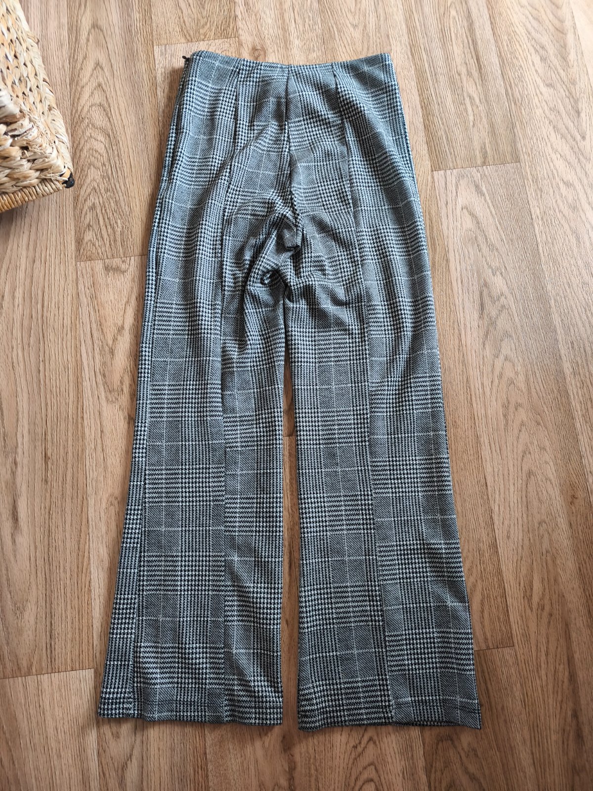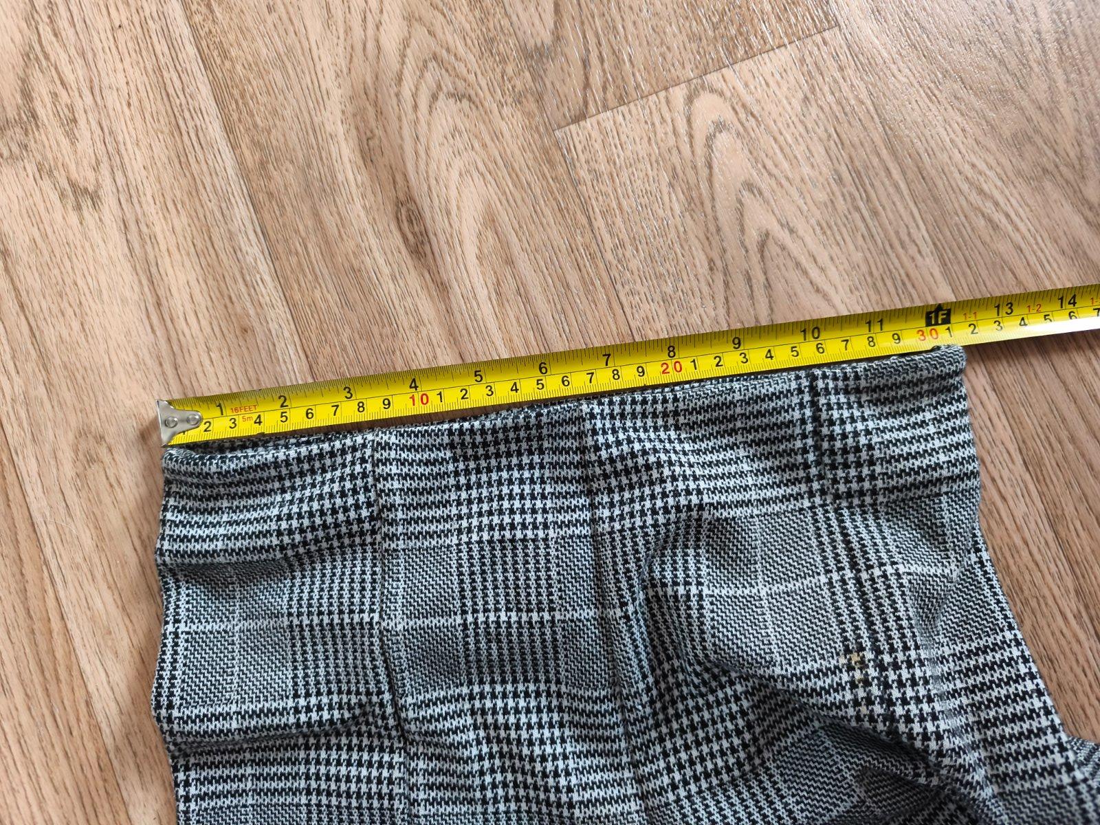 7/8 kostkované kalhoty H&M XS do zvonu pro menší postavu, míry viz fotky. Trošku žmolík, který je vidět jen při bližším zkoumání. Ideální myslím na vel. 158, poměřte.