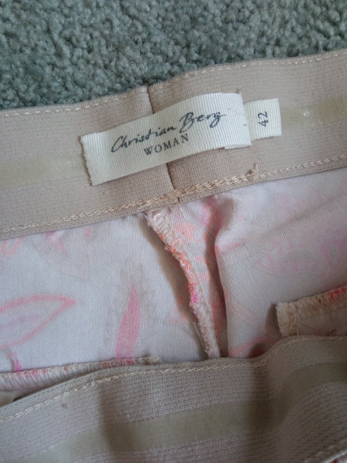 krásné, zajímavé elastické kalhoty, mě už se k ničemu nehodí....jediná vada nafocena- podařilo se mi trochu já nevím jestli "vytrhnout" zadní "kapsu" všimla jsem si až při focení- zašila jsem. Jinak zadní kapsy jsou nefunkční - jen ozdobné - vepředu jsou dvě klasické. V rubu pasu silikonový proužek proti sjíždění kalhot. Délka 98 / 73 cm, pas 2x 42-50 cm, délka předního sedu 27 cm, délka zadního sedu 42 cm, stehno u rozkroku 2x 30-39 cm, šířka spodního lemu 2x 15-20 cm, šířka lýtka 2x 18-23 cm barvy jsou výrazné, ale ne tak zářivé jako na fotkách