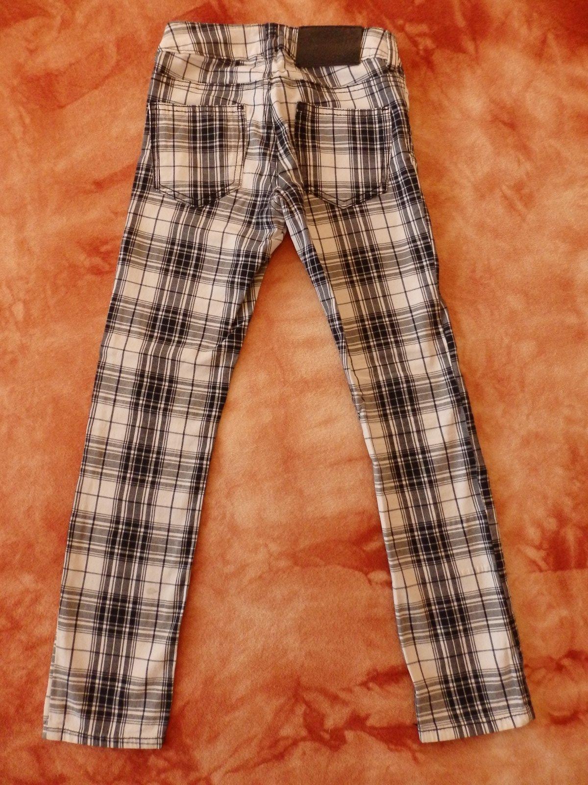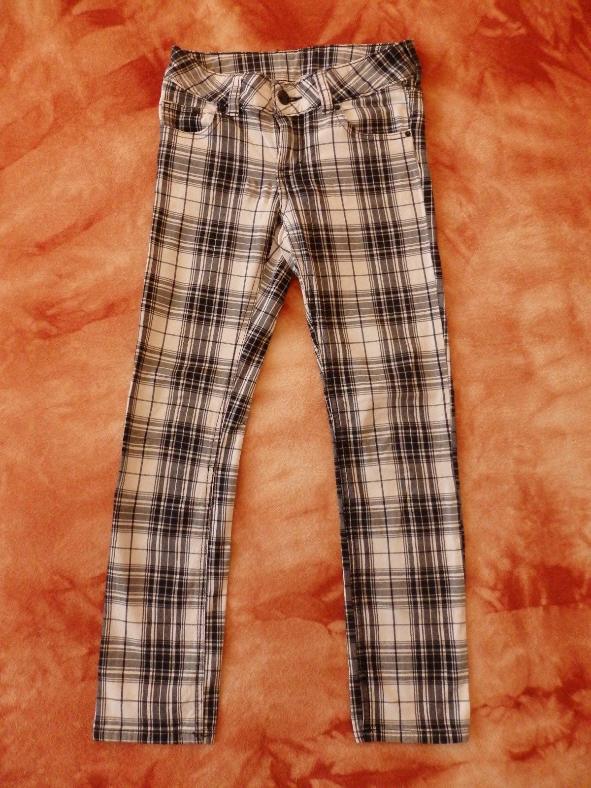 Moc pěkné kalhoty s černobílými proužky, s elastanem, hezký stav. Dvě přední kapsy, dvě zadní kapsy, zapínání na zip a knoflík. Při focení jsem objevila malý světlý flíček zezadu na levé nohavici (viz foto).