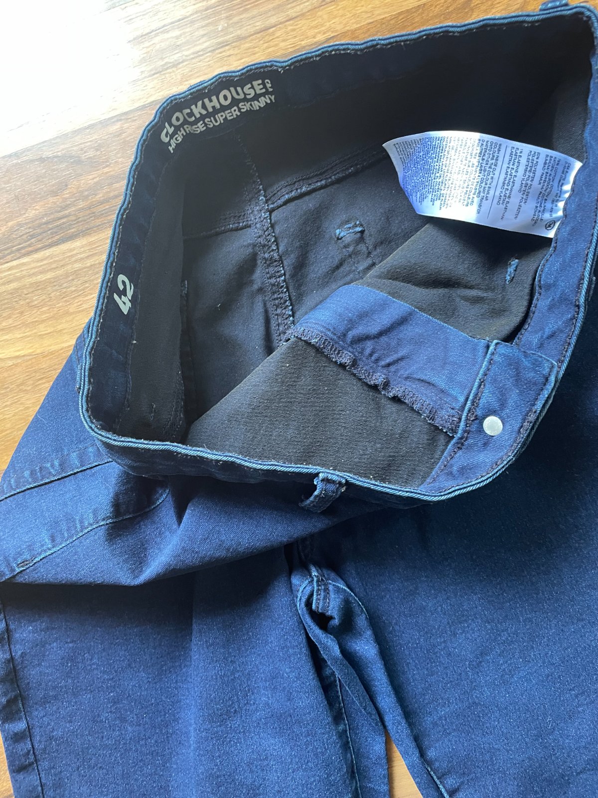 let. nabízím k prodjei tyto tmavě modré džíny/skiny, vel 42, Clockhouse. Materiál 79% bavlna, 20% polyetser, 1% elasten. Jsou pružné. Oprané a zapomenuté v šatníku, bez vad, krásné