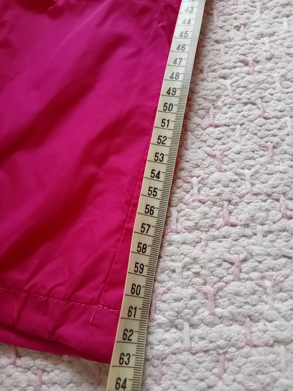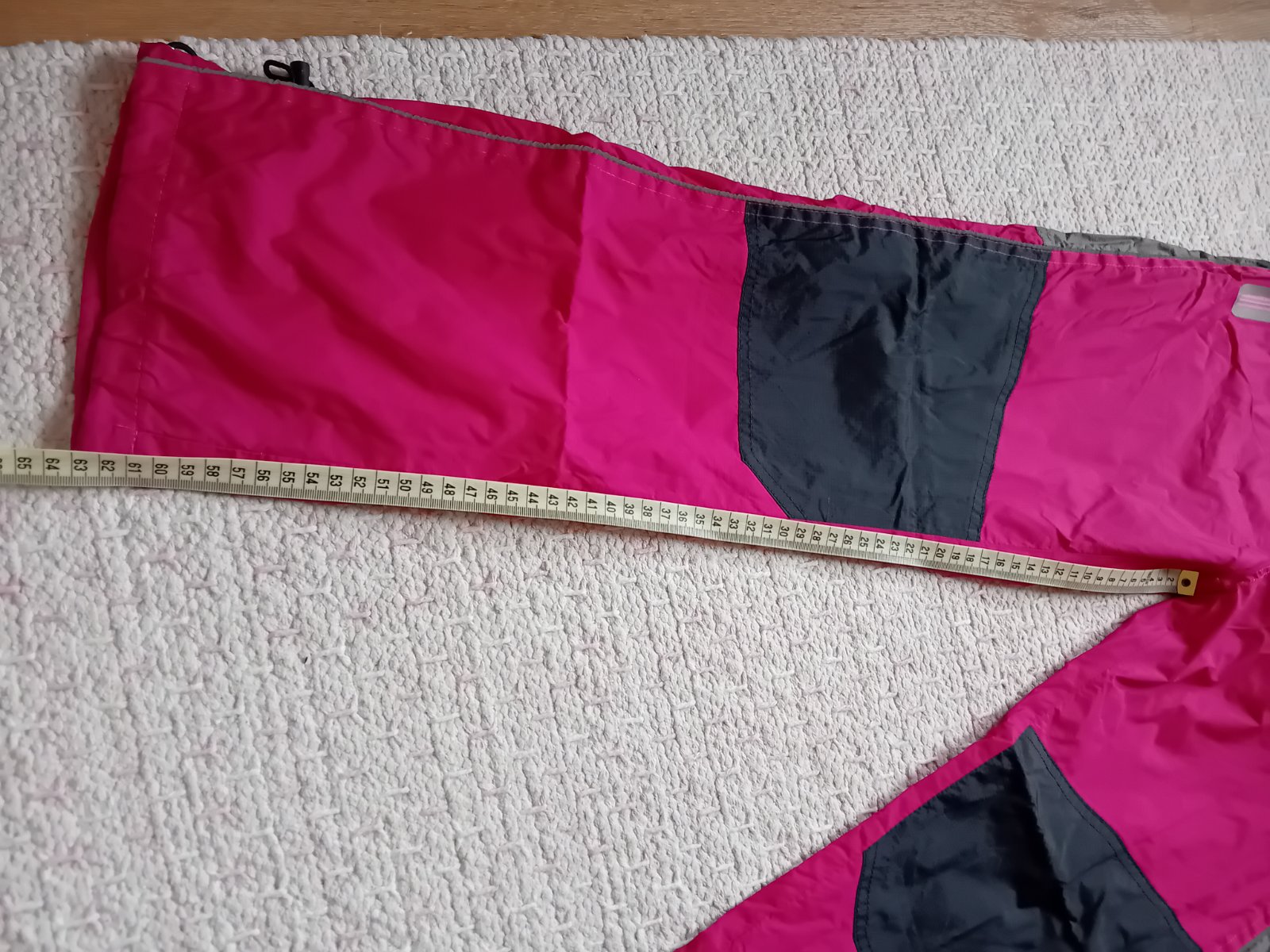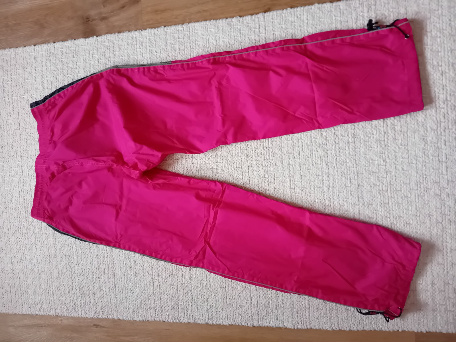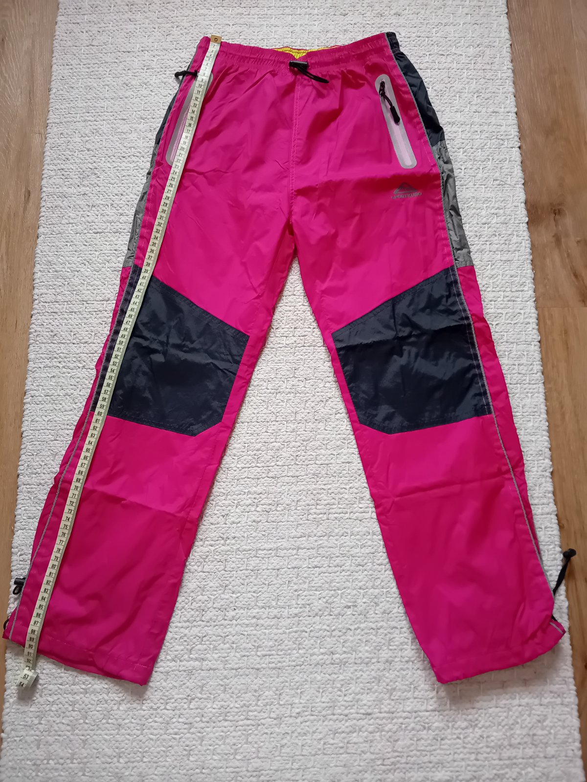 Pěkné přechodové nepromokavé šusťáky - jako nové, mají lehkou příjemnou podšívku a kapsy s nepromokavě řešeným zipem, v pase i na nohavicích se dají stáhnout pomocí druků - vše plně funkční. Míry nohavic viz. fotky.