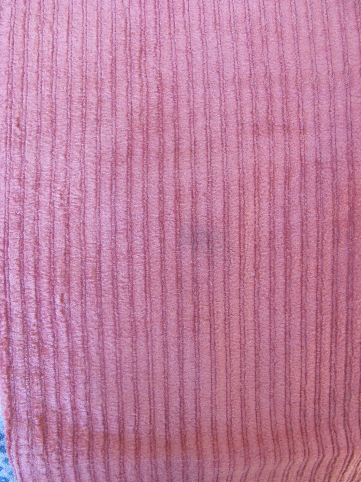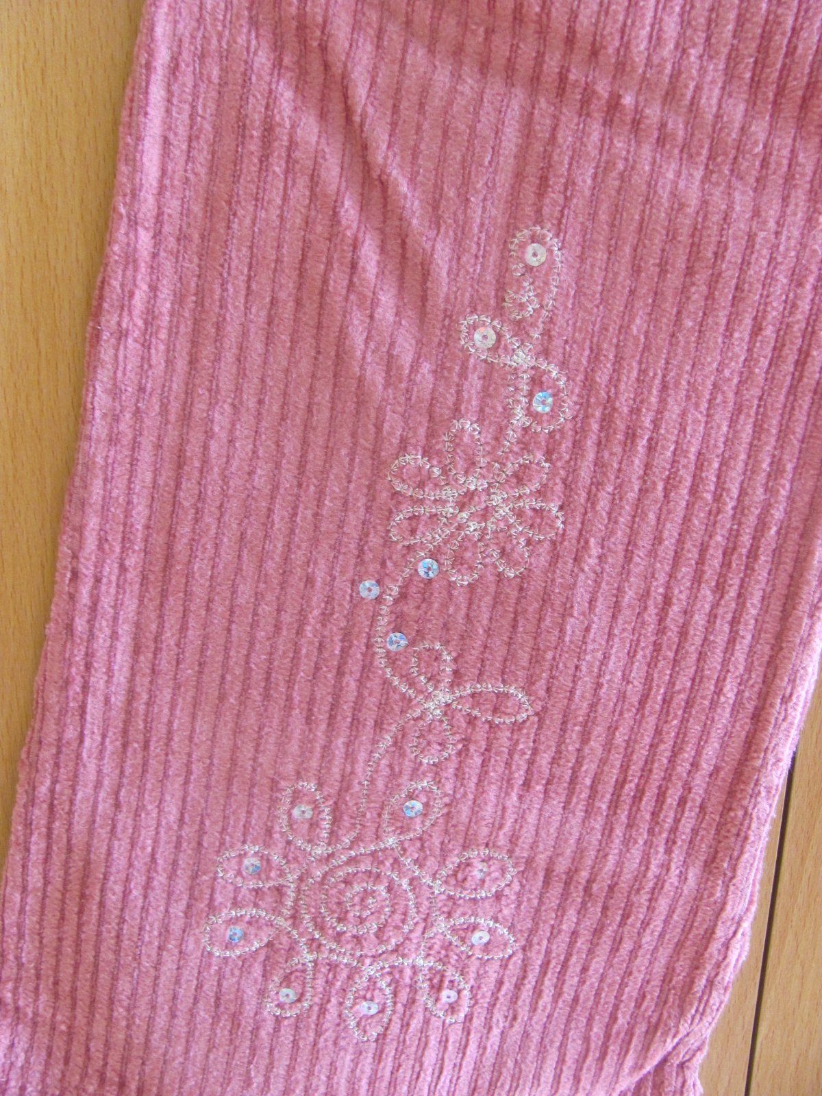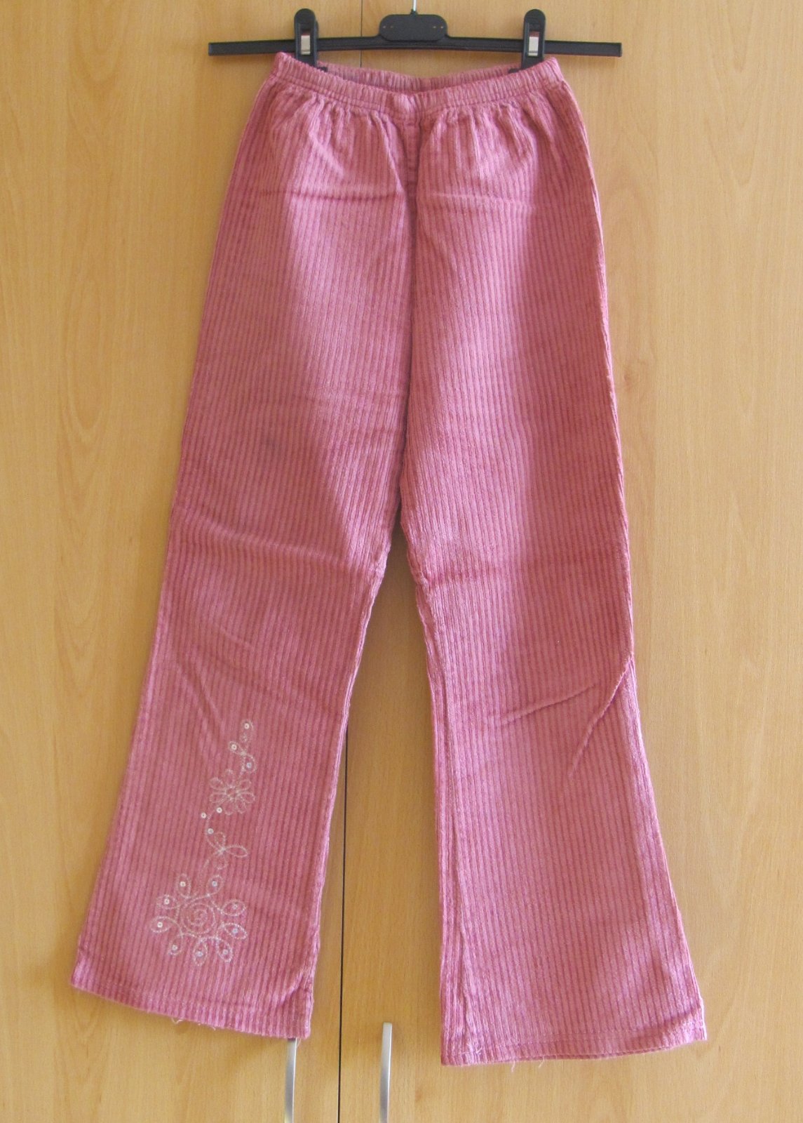 Fialové manšestrové kalhoty, pružné, aplikace na nohavici. Drobná skvrna (viz foto). Velikost 146, pas 23-35 cm, délka 85 cm.