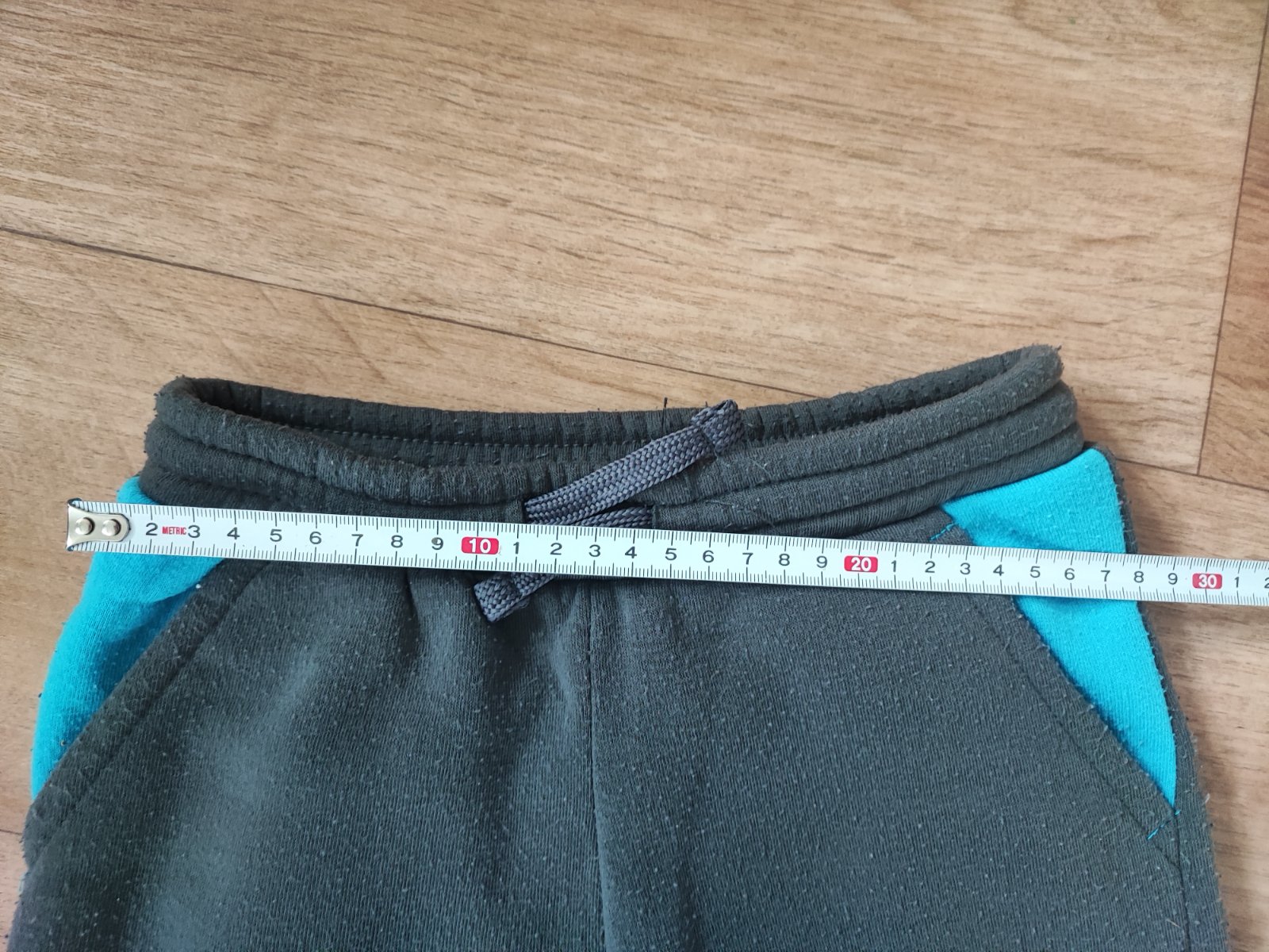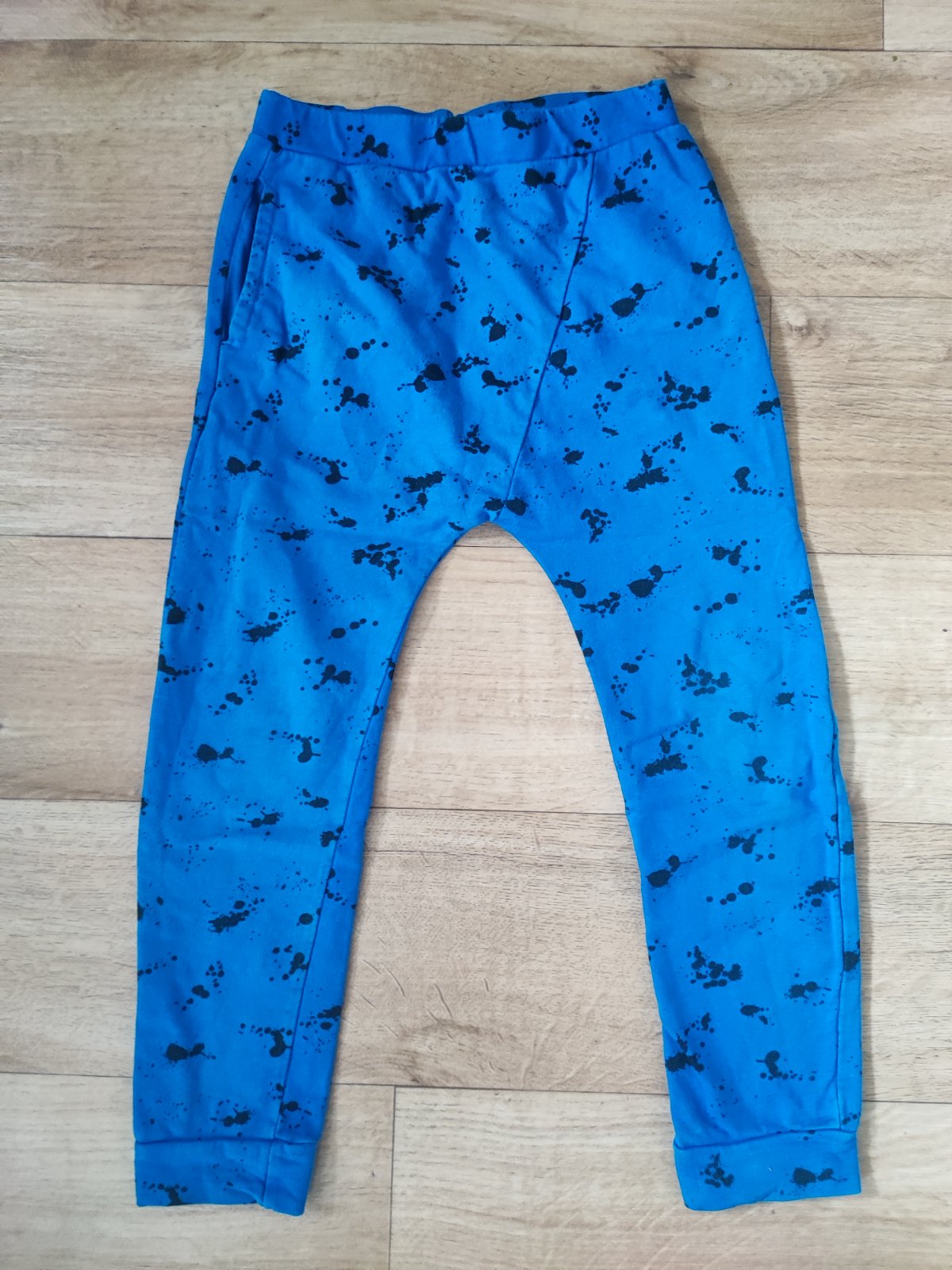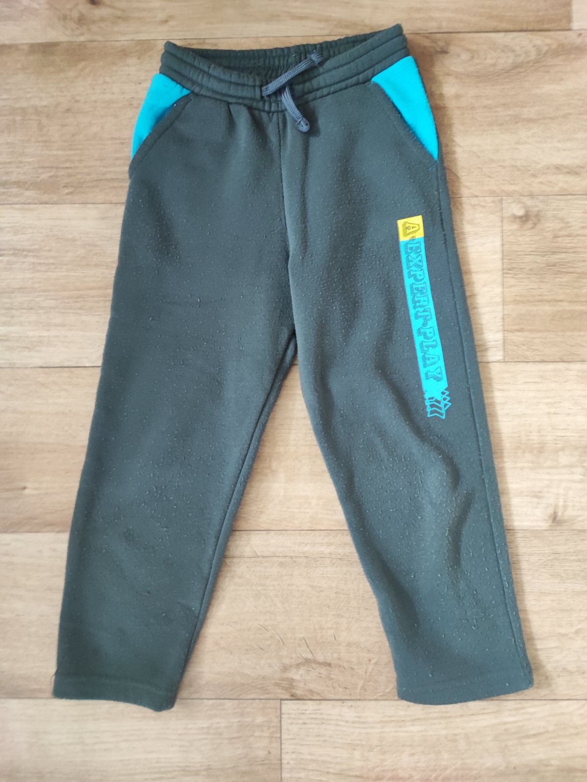 Dvoje tepláky 116/122 - rozměry na fotkách. Šedé jsou teplejší, nošené více než modré.