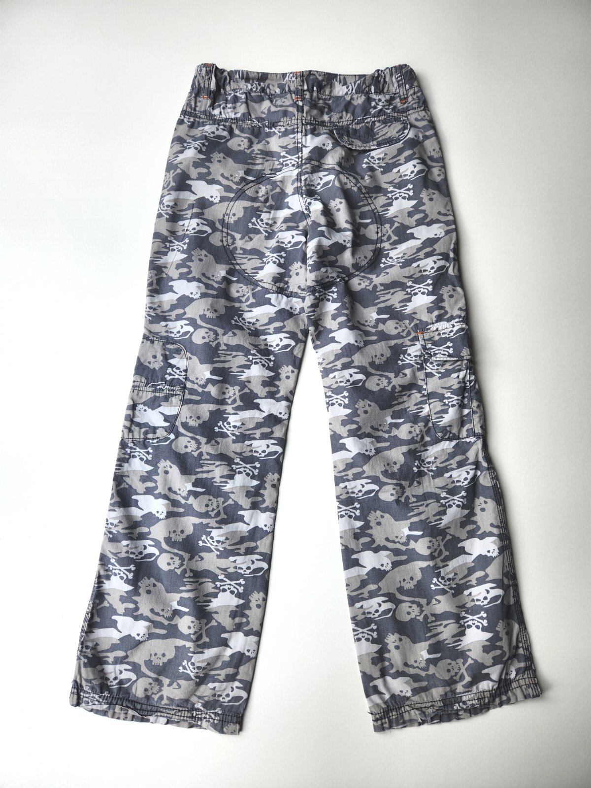 Slabé plátěné kalhoty v šedých tónech s obrázky kosťáků působících jako maskáčový vzor, knoflík, zip, poutka na pásek, v pase regulační guma, přední a nohavicové kapsy, imitace zadní kapsy, kolínkové záševky, dvojité prošívání.