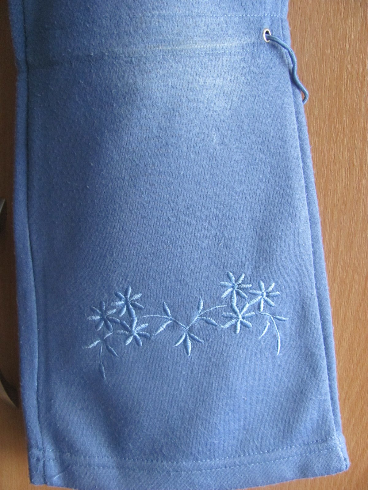 Tepláky mají na sobě dirku a vzadu mají fleky jsou tříčtvrteční.Celková délka je 55 cm.Cena snížená