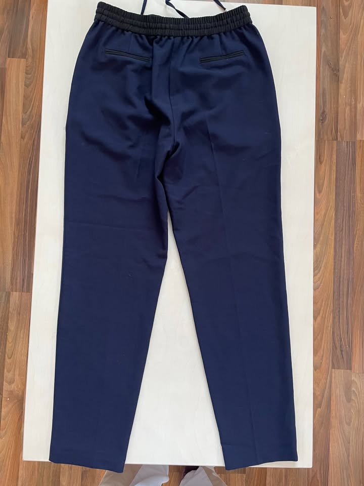 1361. nabízím k prodeji tyto nové volné kalhoty, vel 34/XS, FF. Barva tmavě modrá s černým pasem a lemovkou falešných kapes na zadku (kontrast není tak velký jako na fotu, dělá foto - ta tmavě modrá je tmavá až do černi). Zapínání na zip a háčky + vnitřní háček. Navíc jsou v pase do gumy. Šňůrky s kovovými zvonečky jsou pouze ozdobné k uvázání. Boční kapsy. Materiál umělý, takový ten zrnitý. 75% polyester, 19% viscoza a elasten. Nové, bez vad, krásné