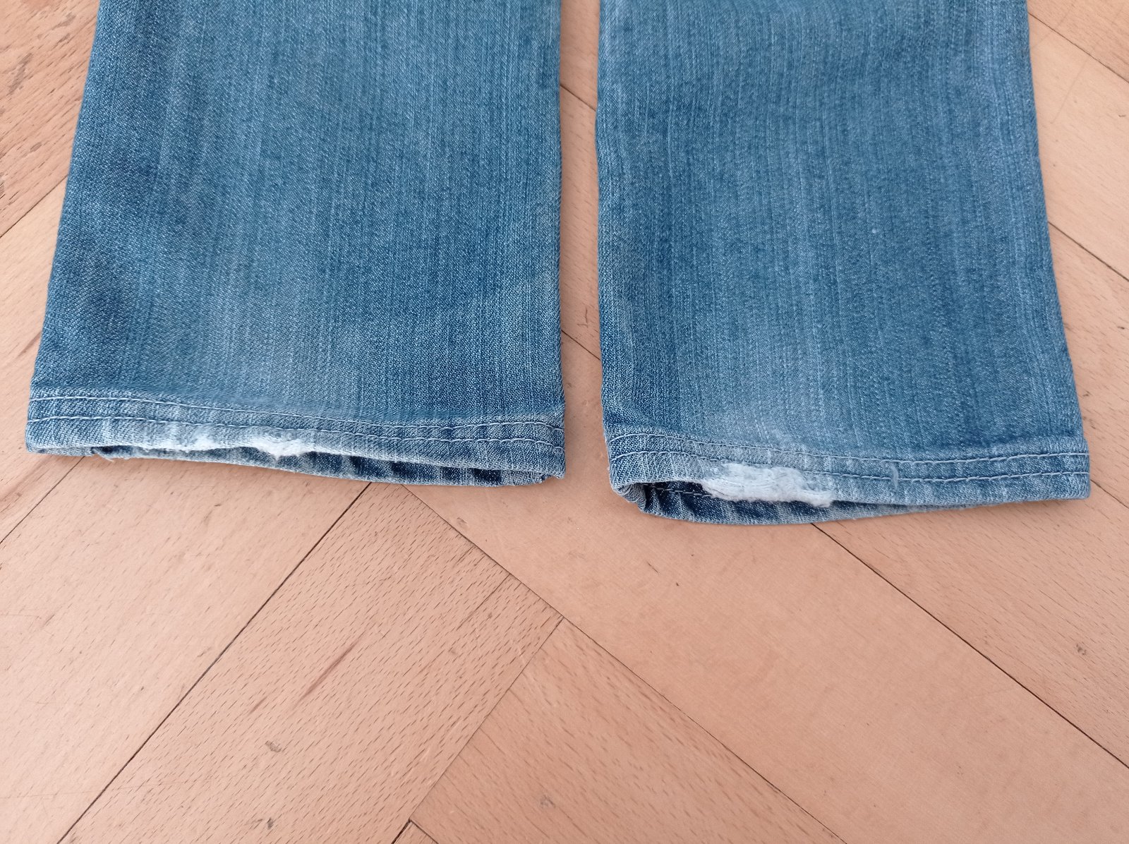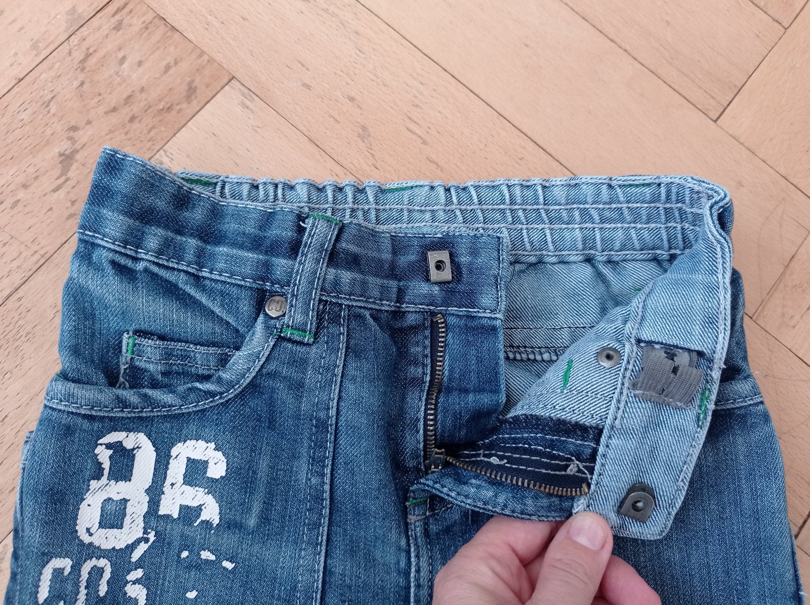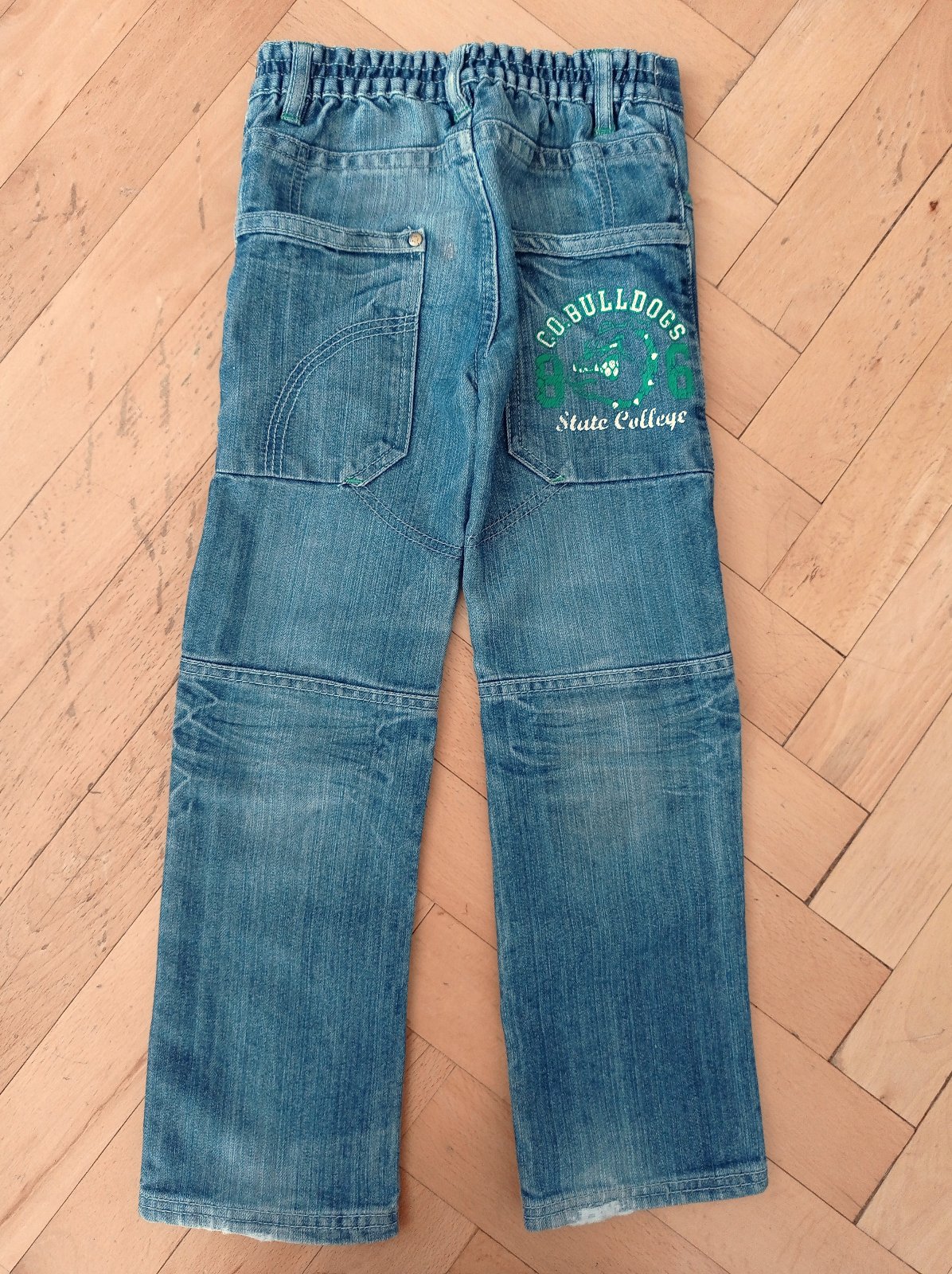 nohavice zezadu roztřepené, nápis se loupe, na zadku zašitá díra