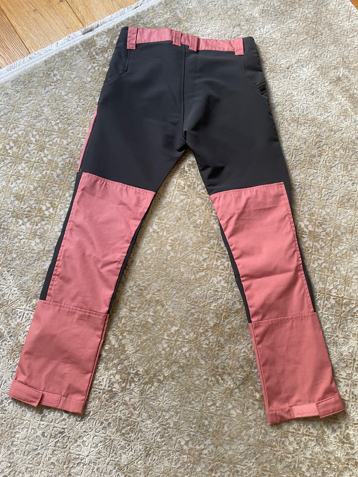 Jsou funkční, prodyšné a kvalitně zpracované. Regulace v pase. Lemy nohavic lze stáhnout. Barva růžová v kombinaci s tmavě šedou. Vhodné spíše pro štíhlejší postavu.