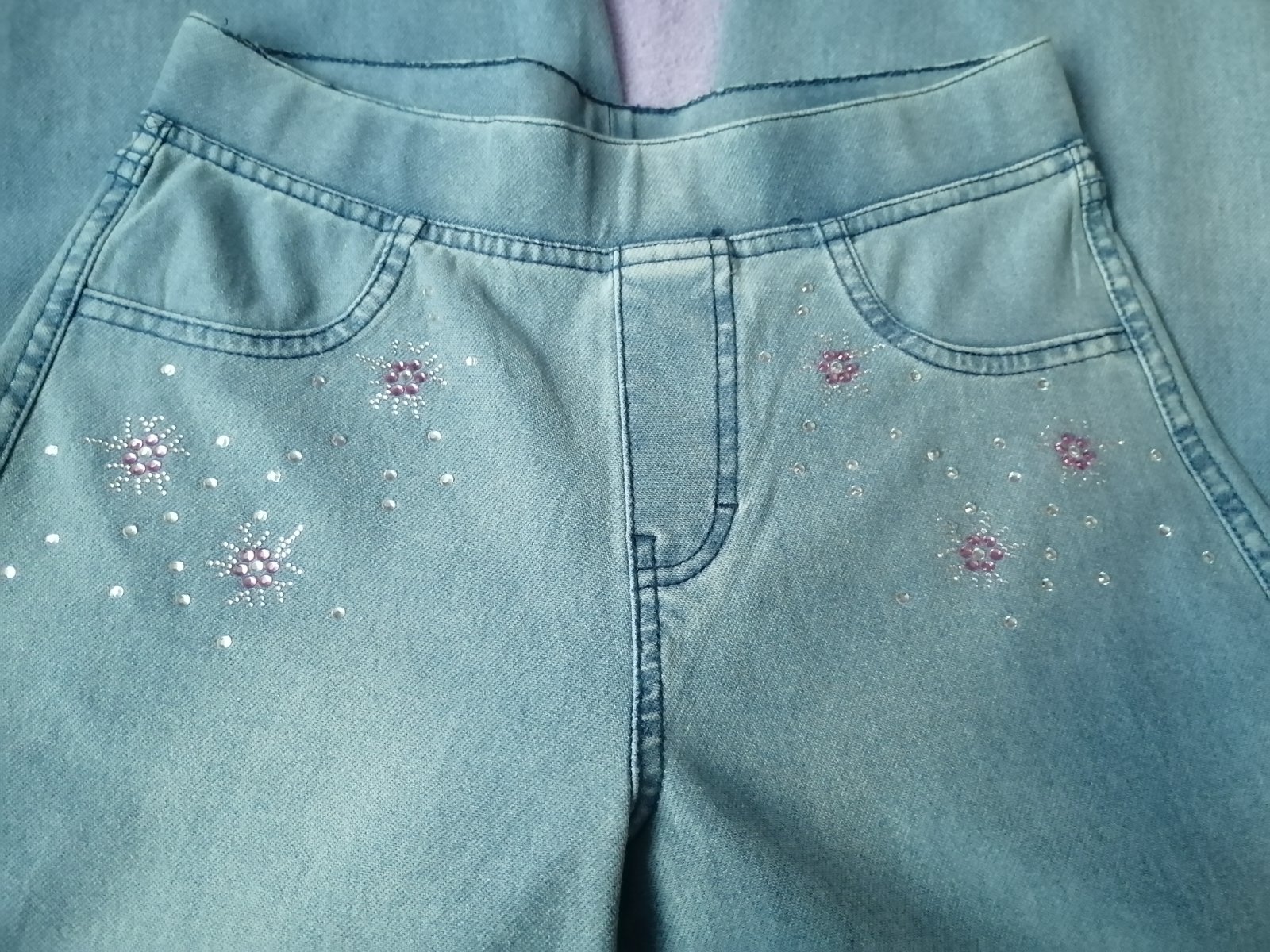 Prodám dívčí kvalitní rifle, v pěkném stavu bez vad. Materiál je příjemný pružný s elastanem. Velikost pasu nastavitelný pomocí gumičky viz foto. Rozměry viz foto